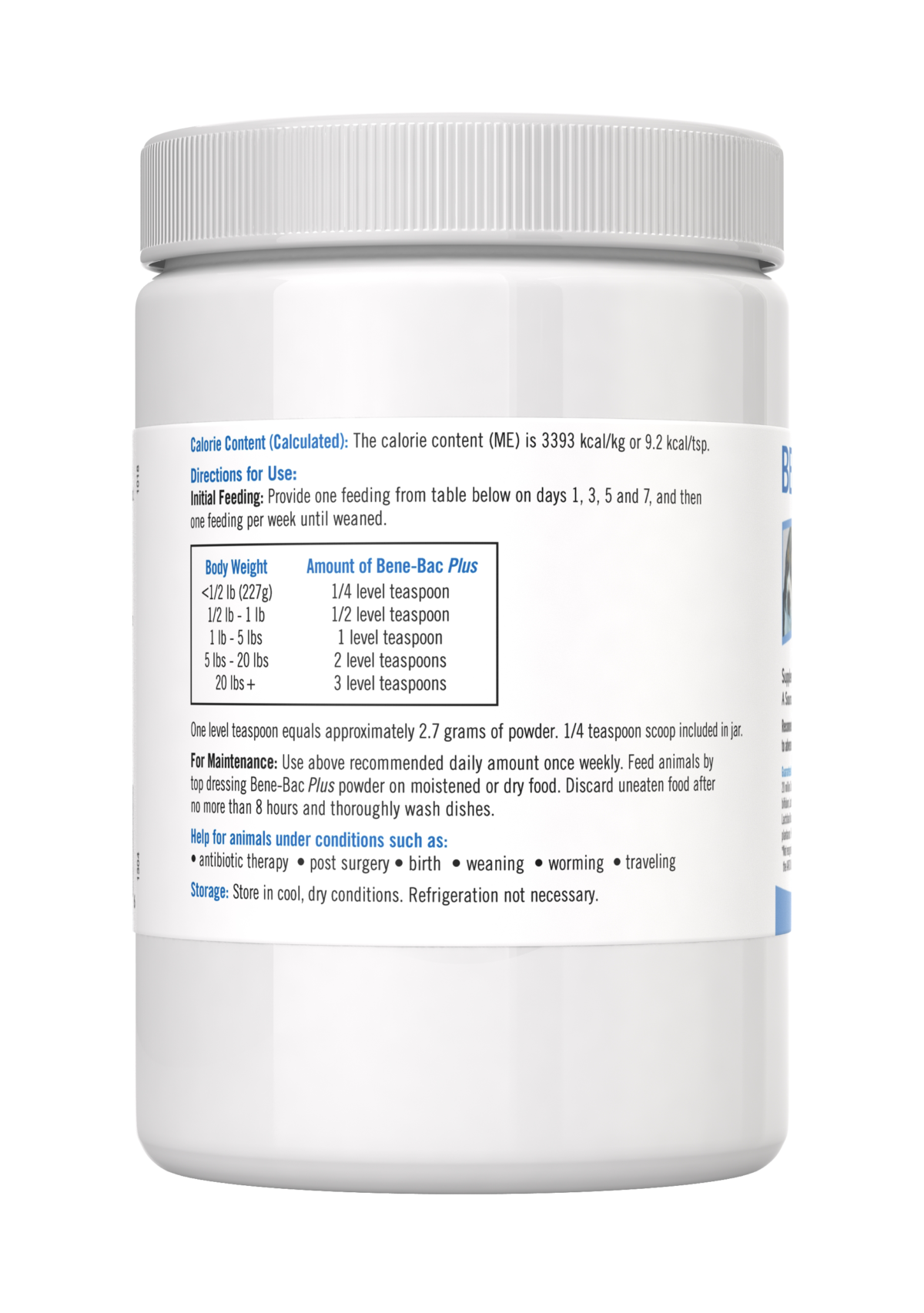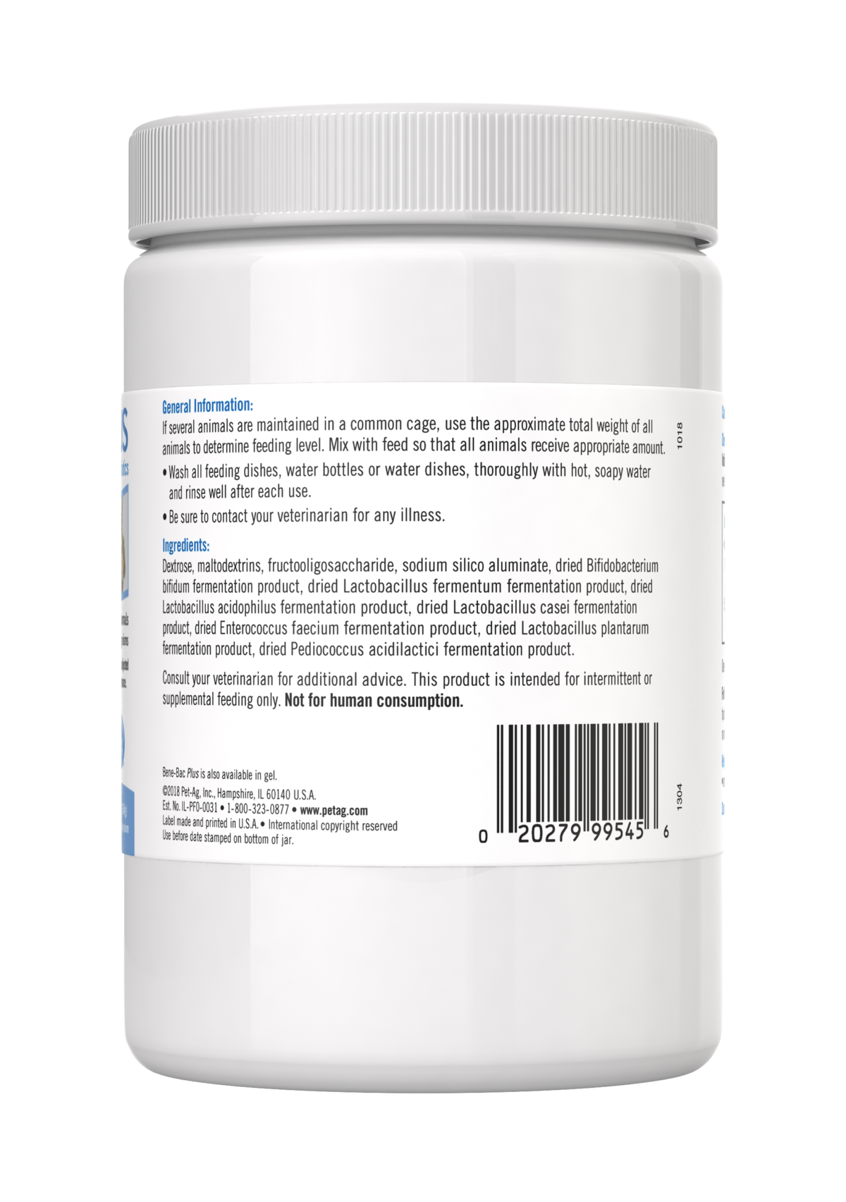 Probiotic powder supplement that supports digestive health in birds, reptiles, small animals, dogs, and cats. PetAg Bene-Bac Plus helps maintain beneficial gut bacteria during stress, diet changes, or recovery.
