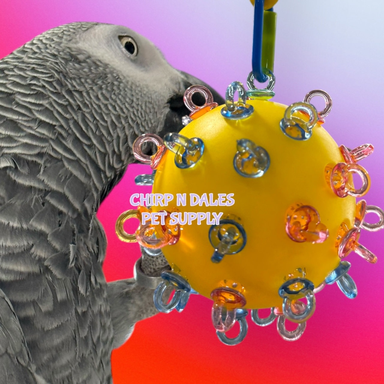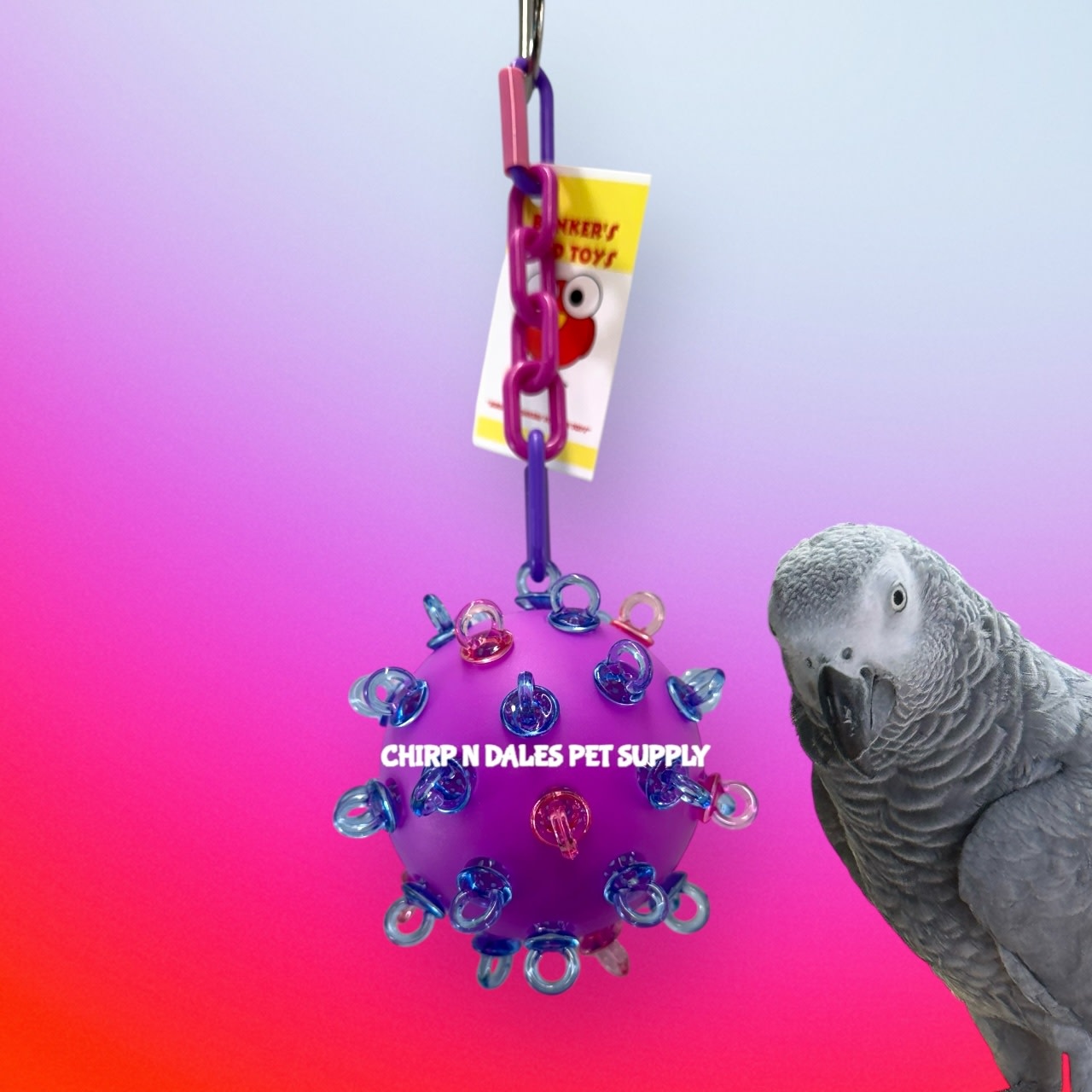 Meet the Bonkers Bumpy Binky Ball Jumbo Parrot Toy! This giant 3-inch ball is packed with 40 colorful acrylic pacifiers for your birds to twist and turn. Perfectly silly for little to big beaks—it's a playtime party!!