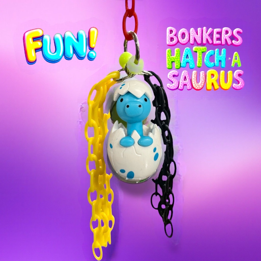 Bonkers Lop-Eared Spinner Bird Toy! This 9" x 6" toy hangs on a stainless steel base and features colorful Easter bunnies, beads, palm finger traps, and porcupine balls. Perfect for small to medium birds, it's a fun, interactive toy for shredding and play