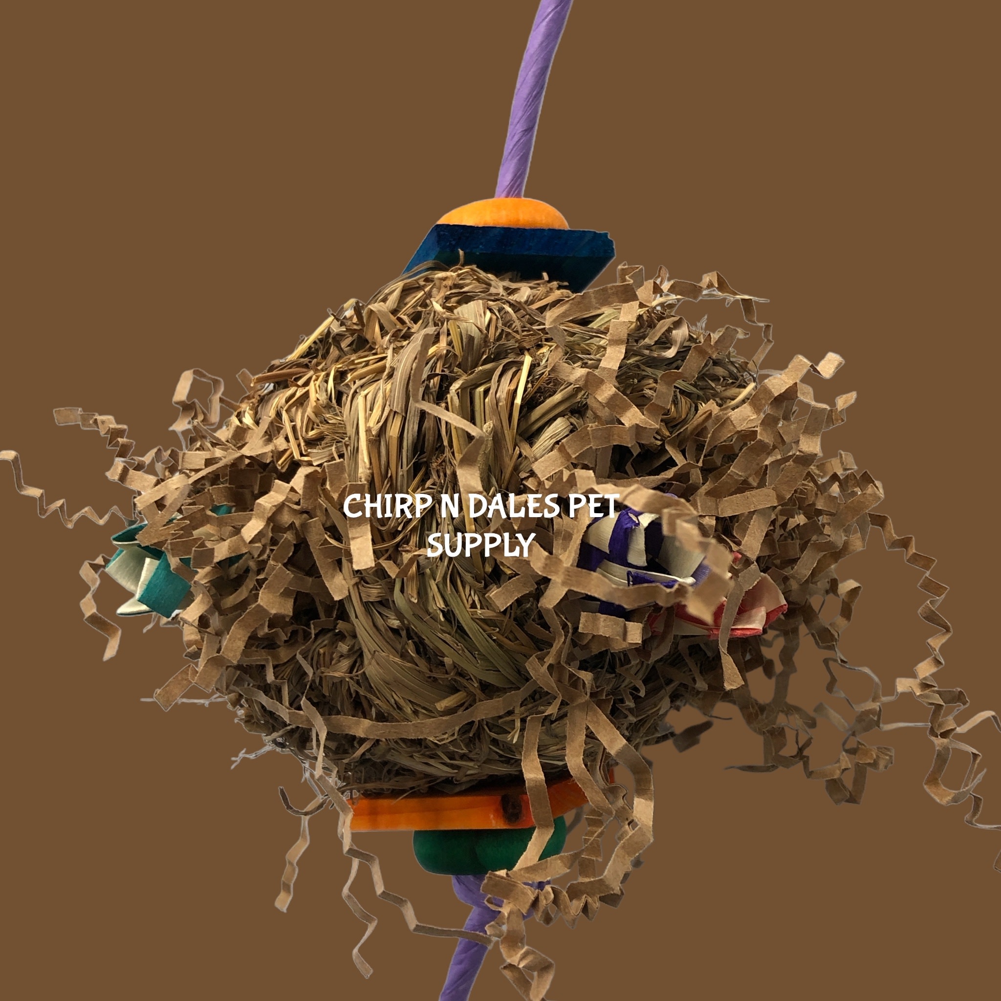 Large stuffed 5" grass ball, filled with colored shred and crunchy finger traps.
