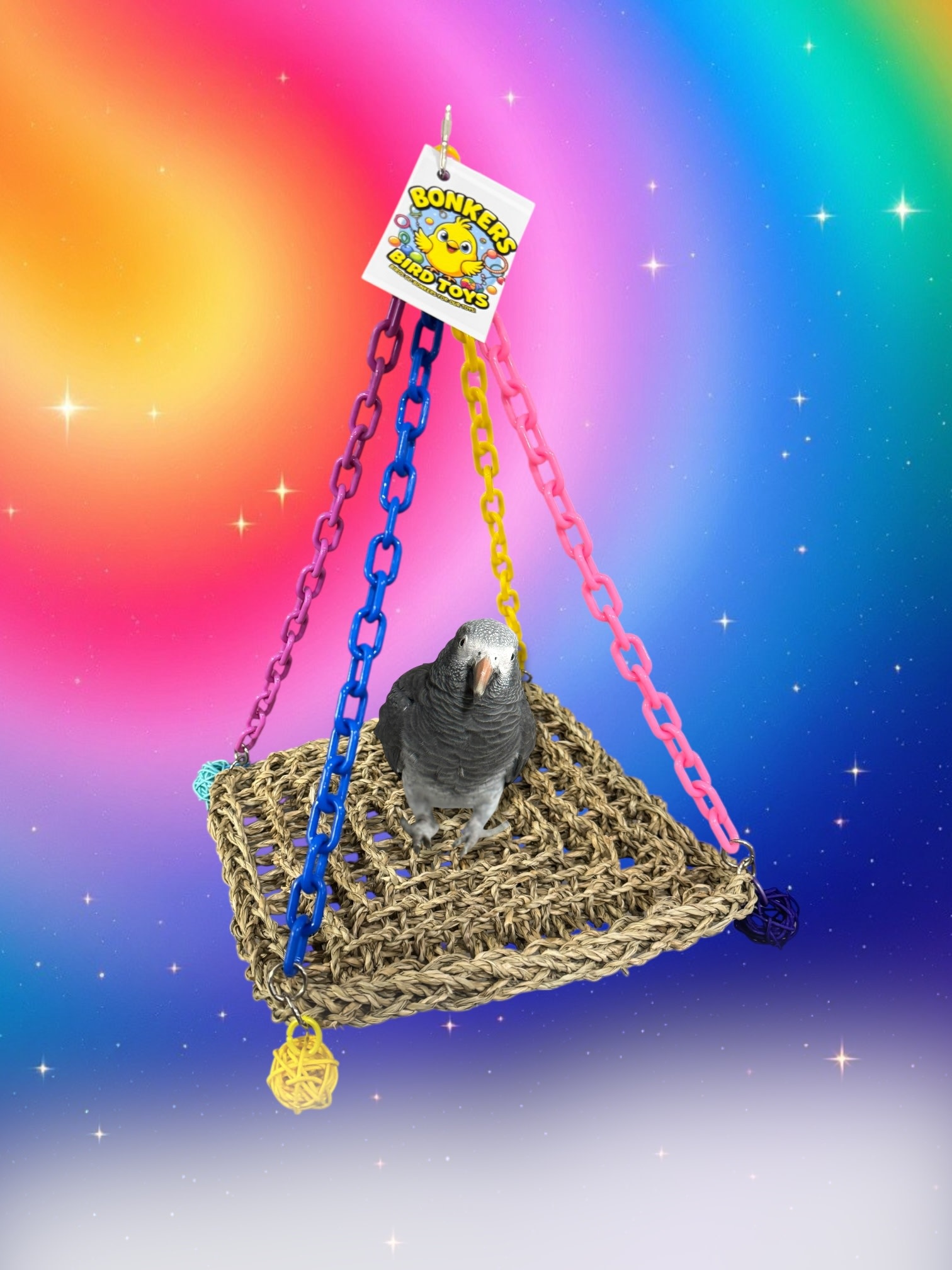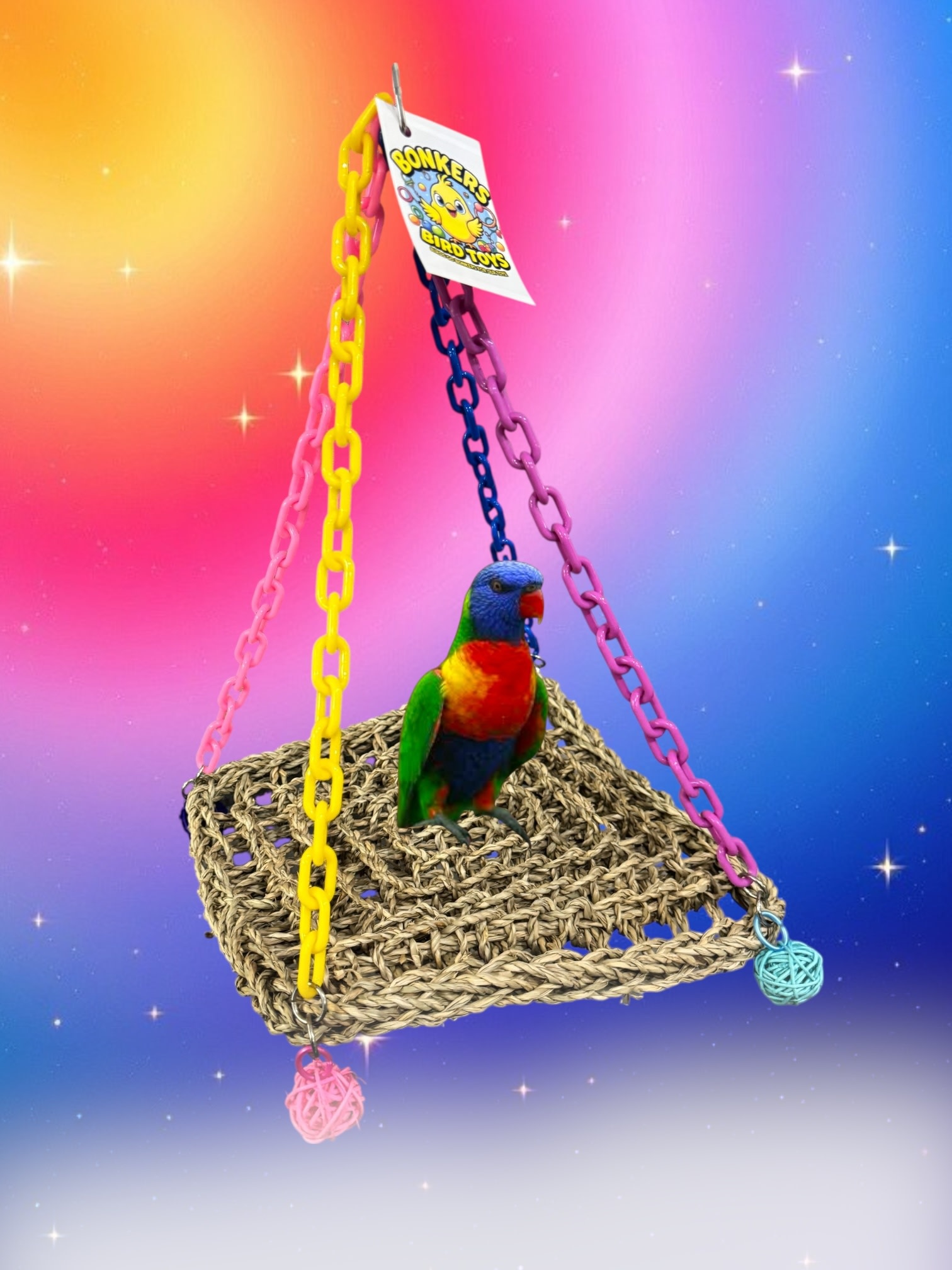 A sturdy 10x10x16" seagrass swing built for fun! Thick mat, heavy-duty plastic chains, non-toxic hardware, and colorful vine balls. Perfect for playful Quakers, Conures, Timneh Greys, Ringnecks, and more.