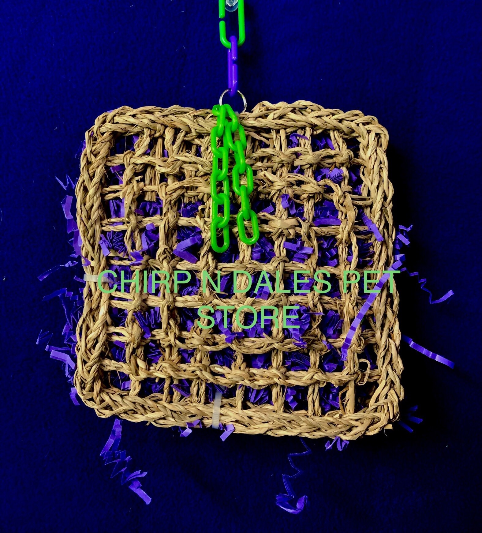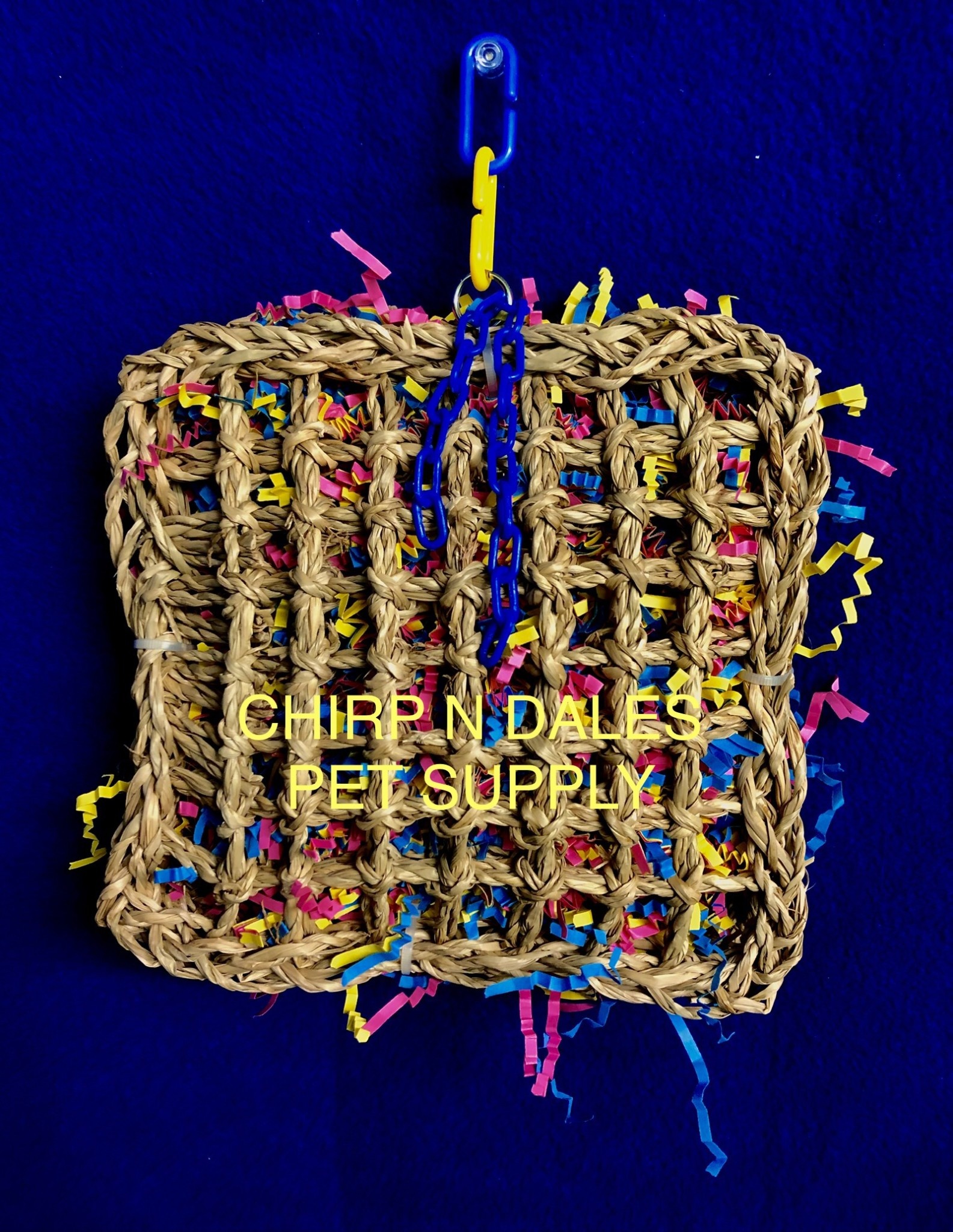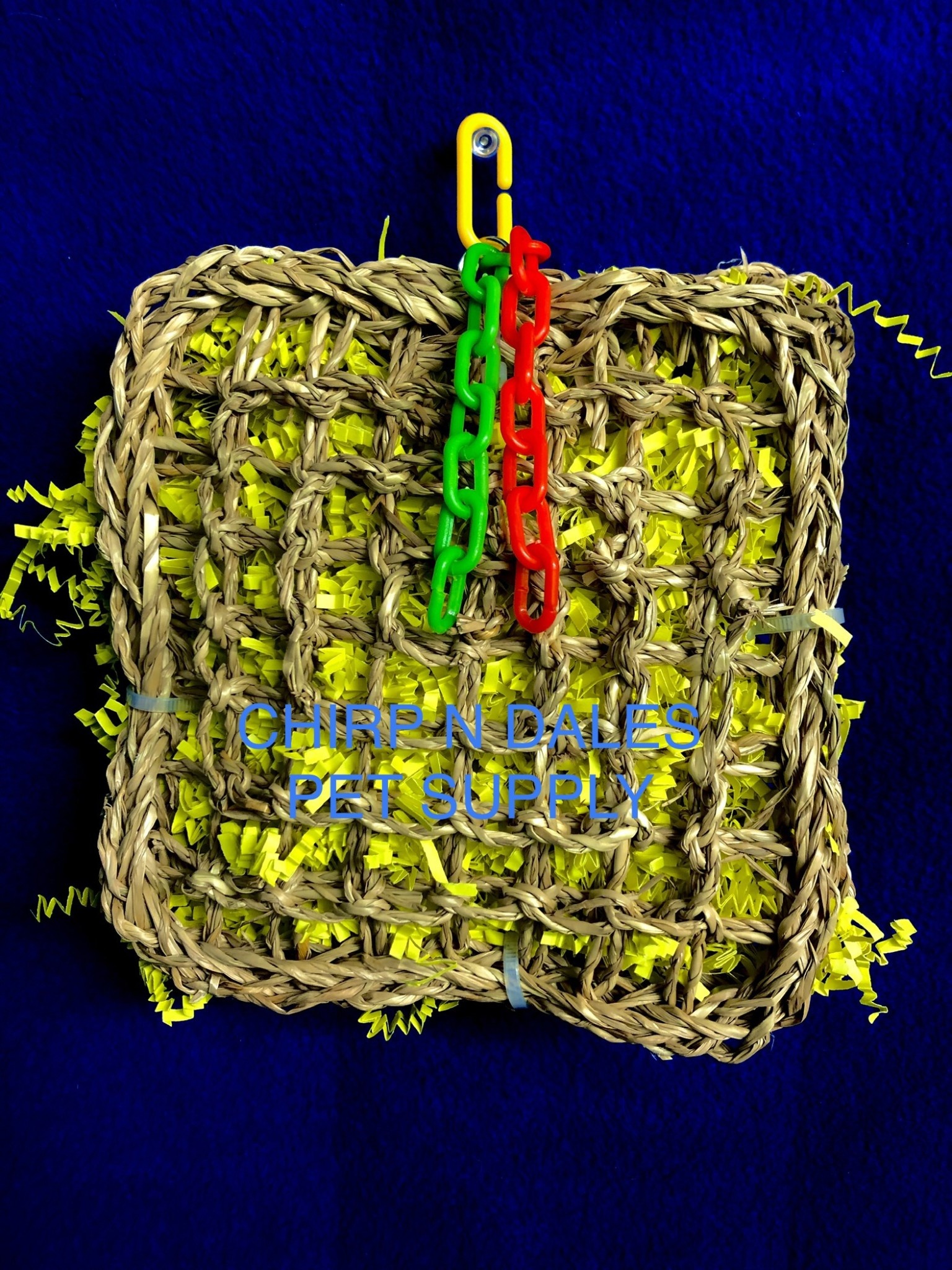 Seagrass shredder perch 7" x 7" double seagrass mats are stuffed with lots of colorful shredded paper and adorned with chunky plastic chain.