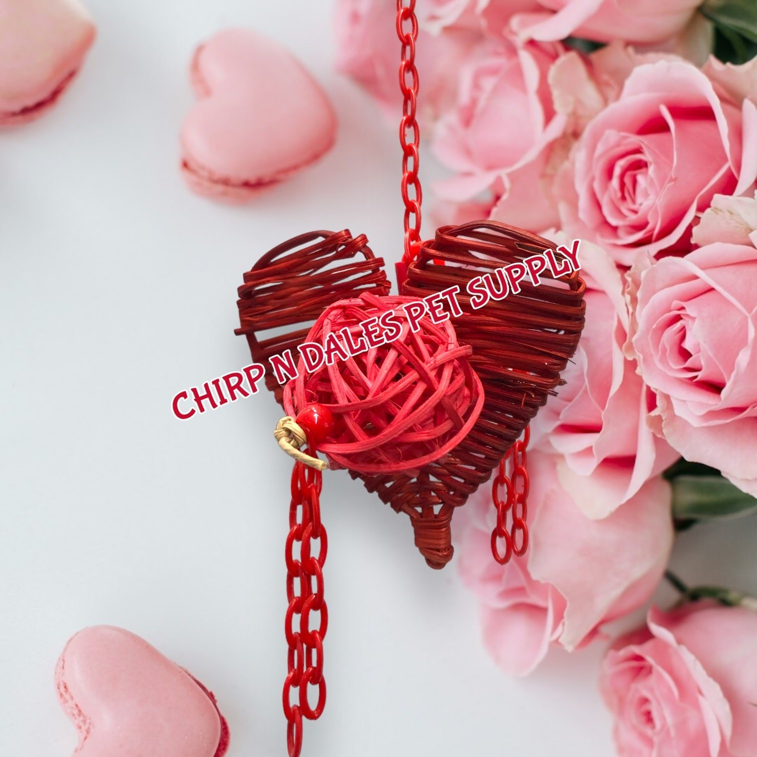 Fun Valentine-themed foraging boxes filled with shreddables and colorful parts for birds to explore. Encourages chewing, foraging, and enrichment. Suitable for small to medium birds.