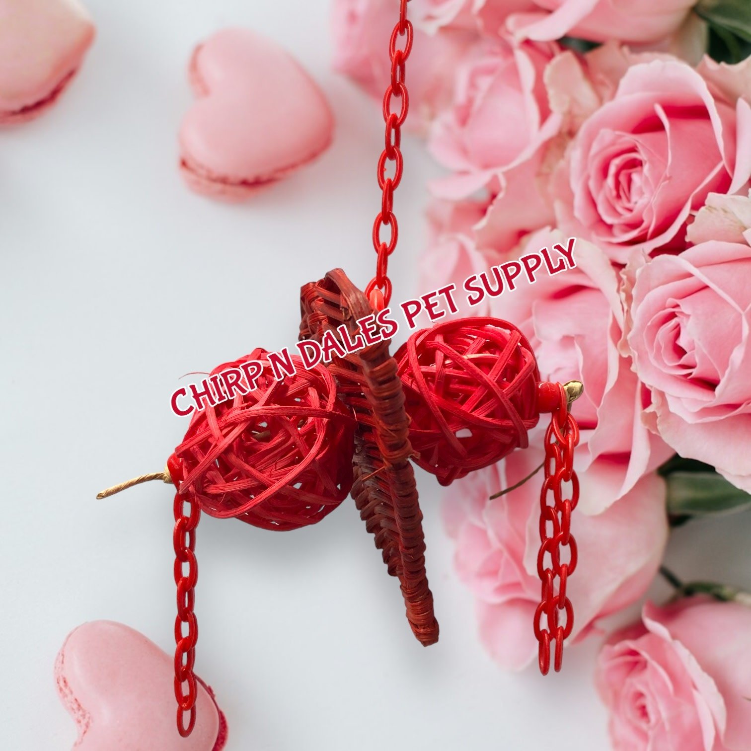 Fun Valentine-themed foraging toy made with seagrass, veggie-tanned leather, shredded paper, wooden shapes, wiffle balls, and acrylic pacifiers. Durable chain and pear link. Canadian made.