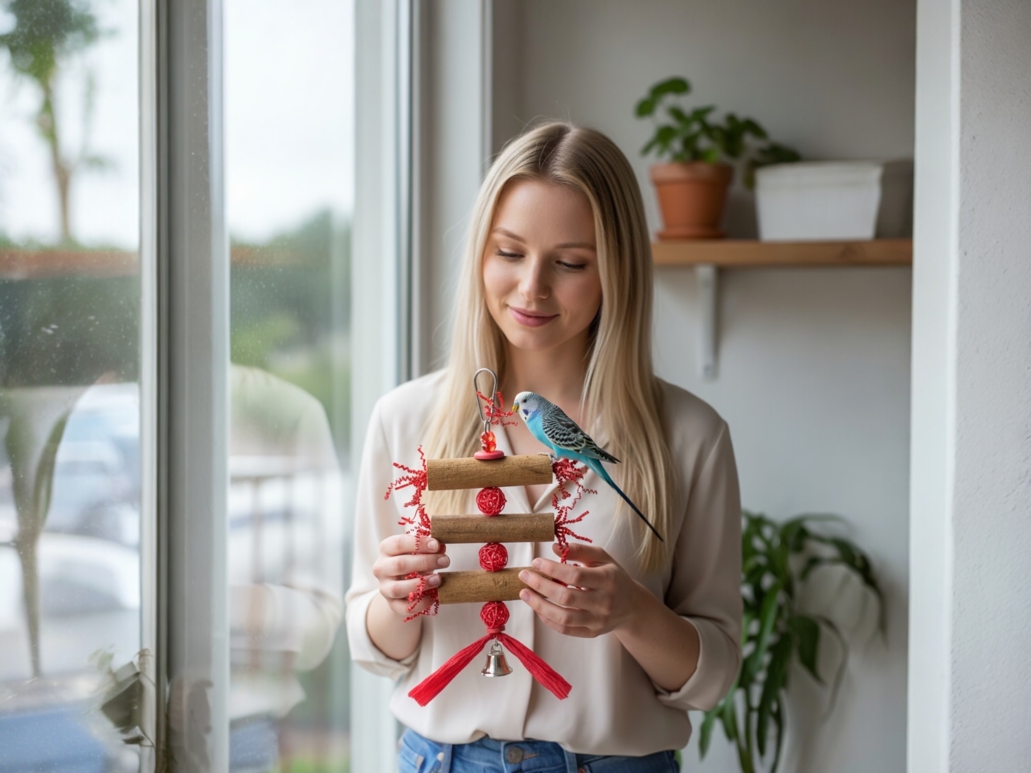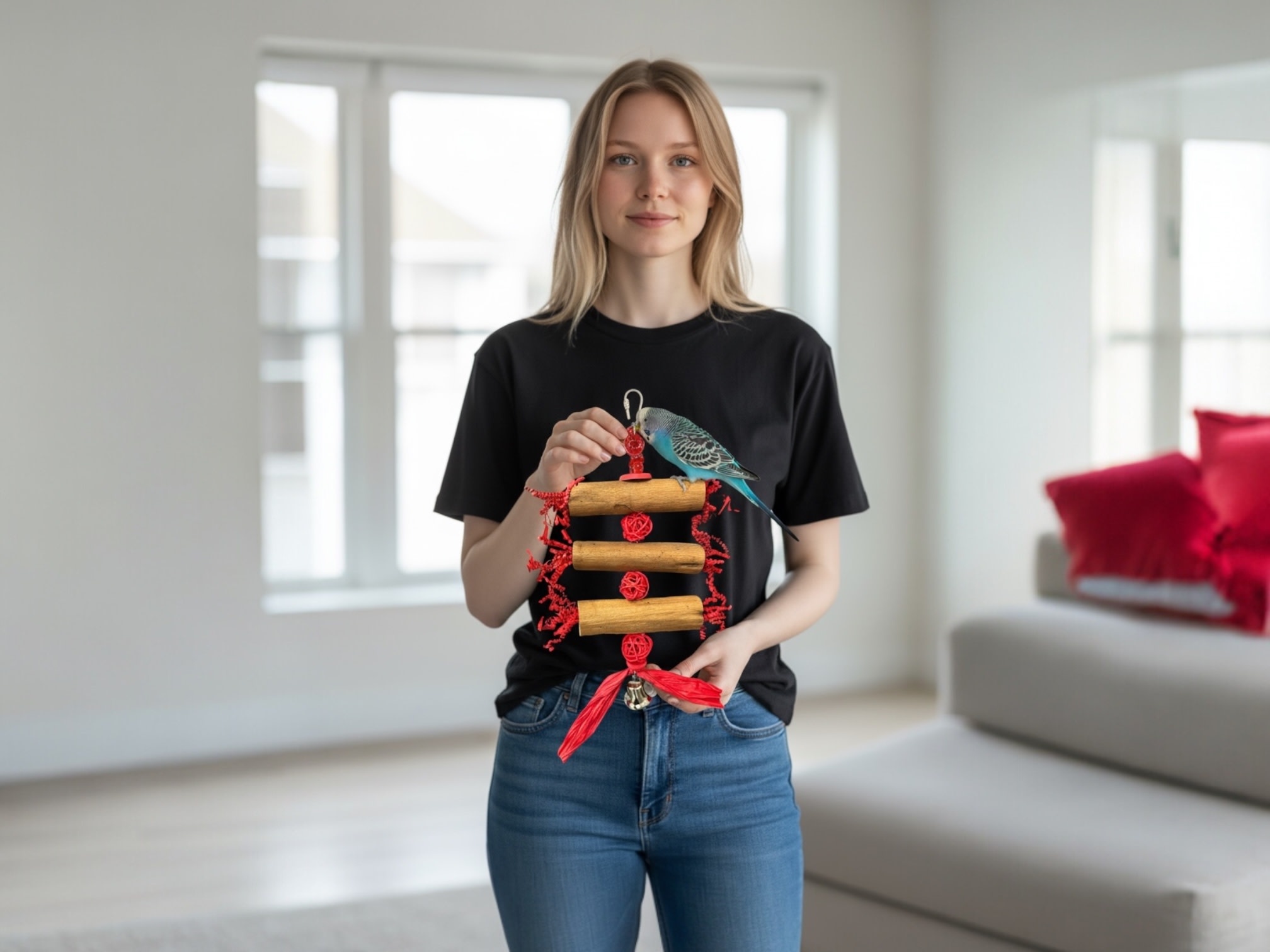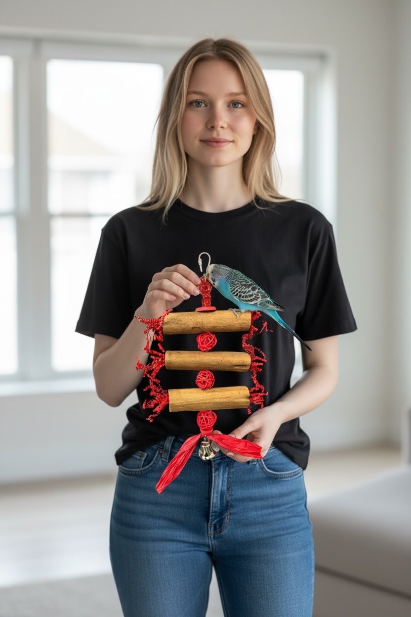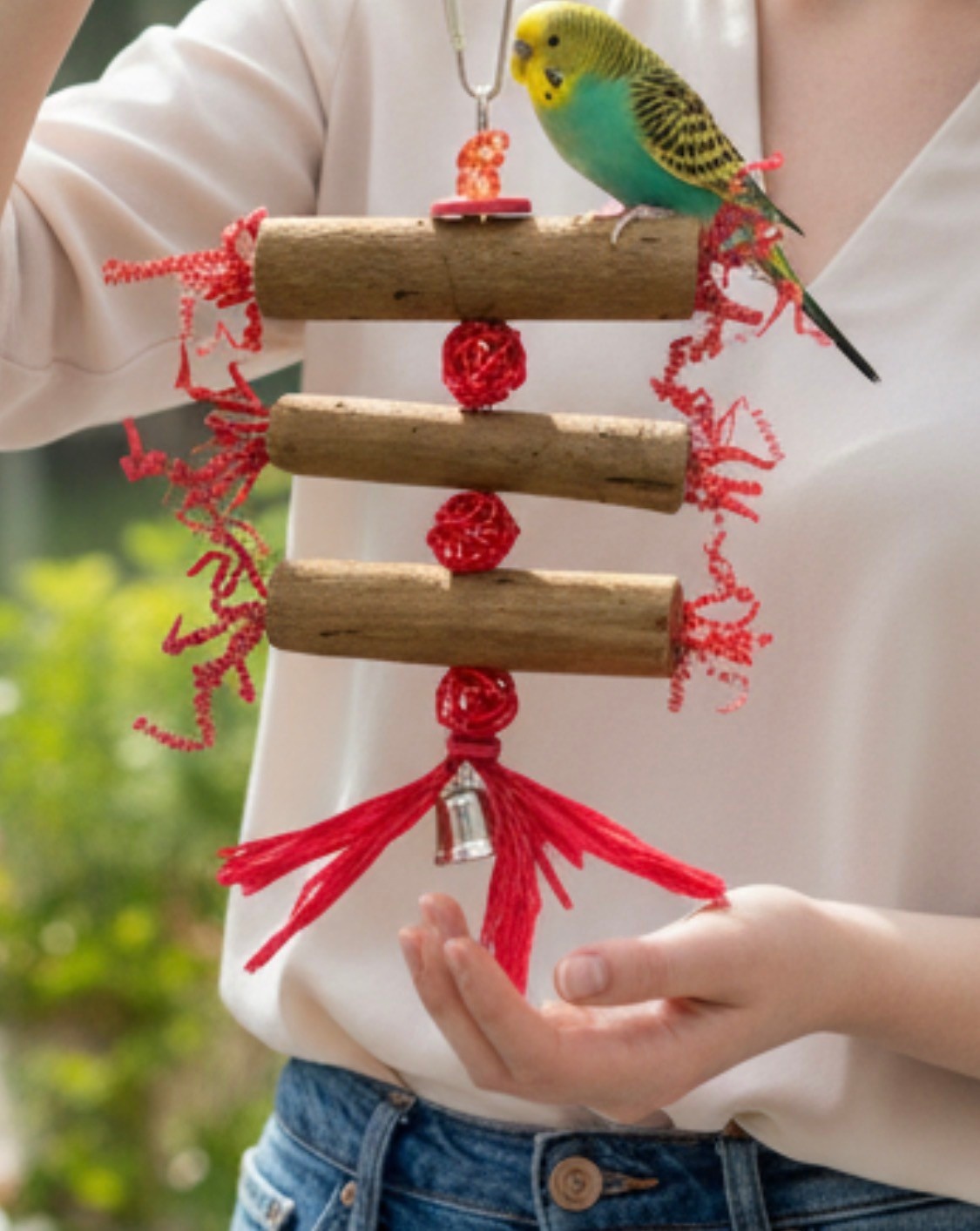Festive 11” x 6” sola spinner made with chunky sola logs, vine balls, acrylic pacifiers, paper rope, paper shred, and a nickel-plated bell. Perfect for chewing, shredding, and enrichment for small to medium birds.