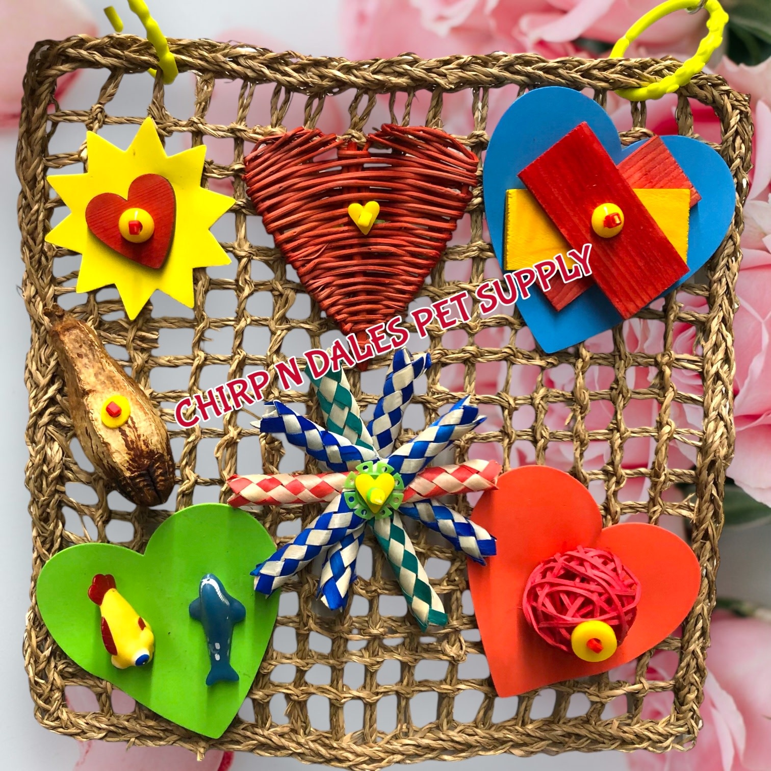 Large Valentine-themed seagrass activity mat designed for foraging, chewing, and enrichment. Ideal for cage walls and play areas for birds of all sizes. Proudly Canadian made.