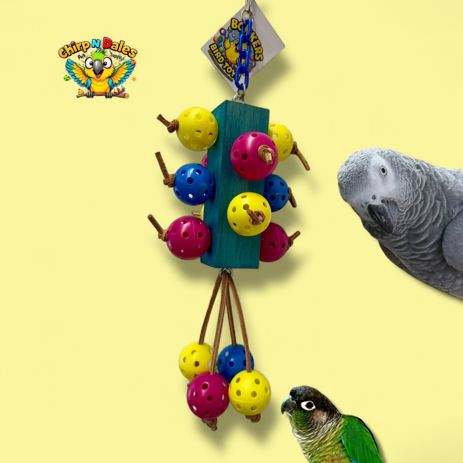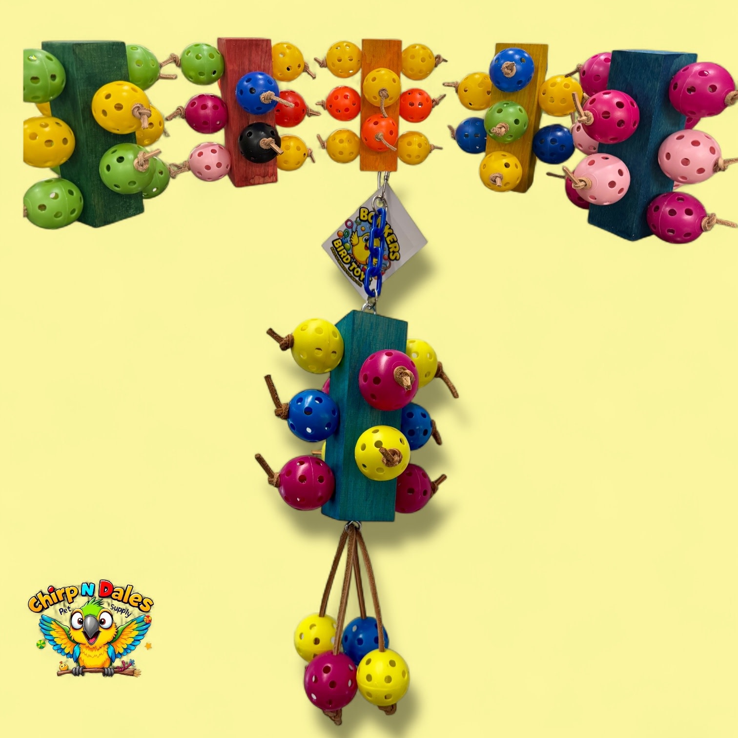 The Bonkers Whopper Wiffle Wobbler is an 18"x 5" pine block bursting with 14 colorful wiffle balls and veggie-tanned leather, hung on a sturdy plastic chain....it’s durable, zany fun!