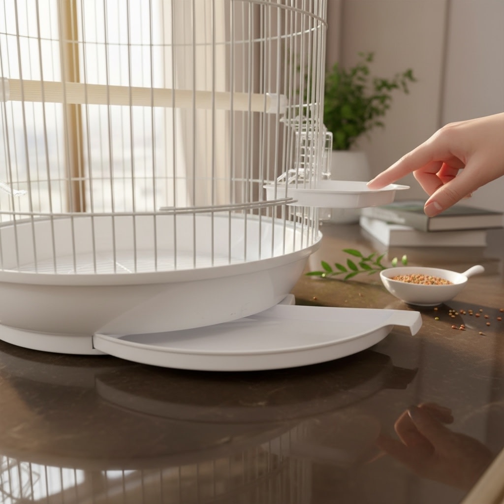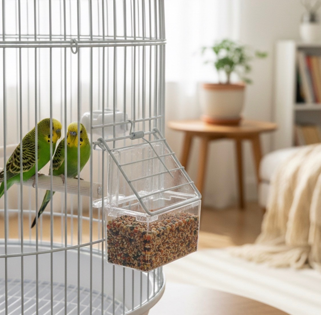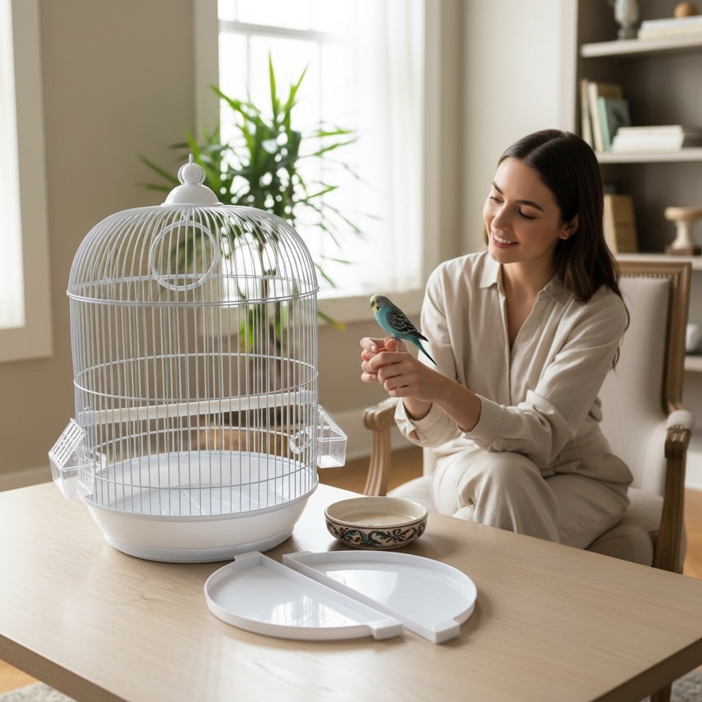 White parrot cage measuring 47x36x68 cm (18.5x14.2x26.8"). Spacious, sturdy, and ideal for Cockatiels and Lovebirds. etc.