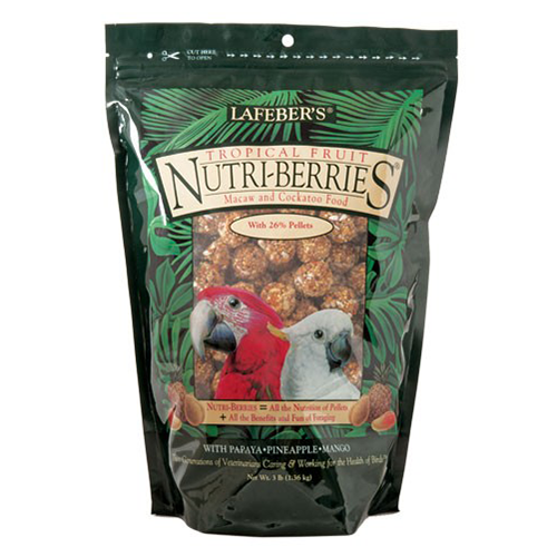 Tropical Fruit Nutri-Berries for Macaws combine whole seeds and grains with real pieces of pineapple, papaya, and mango, along with 26% pellets to give your bird balanced nutrition without sacrificing taste or texture. All of these wholesome ingredients are rolled together in a berry shape perfectly sized for your macaw or cockatoo to hold in his foot so he can relish each bite.