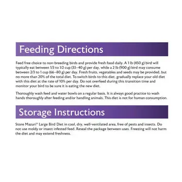 - Monitor the bird’s weight and behavior carefully during the conversion period and make sure it is eating the new diet. Be especially attentive during the 10th to 12th day. If the bird is losing weight, or if the bird is not consuming the product, offer the bird a mix of50% seed and 50% Mazuri® bird diet and restart the conversion process from this point.