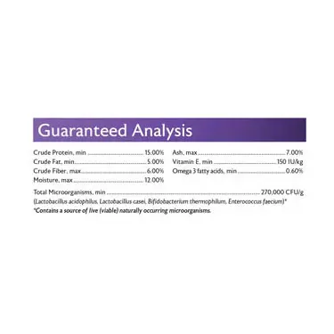 Crude protein not less than Crude fat not less than Crude fiber not more than Moisture not more than Ash not more than Vitamin E not less than Omega-3 fatty acids not more than Total Microorganisms not less than |