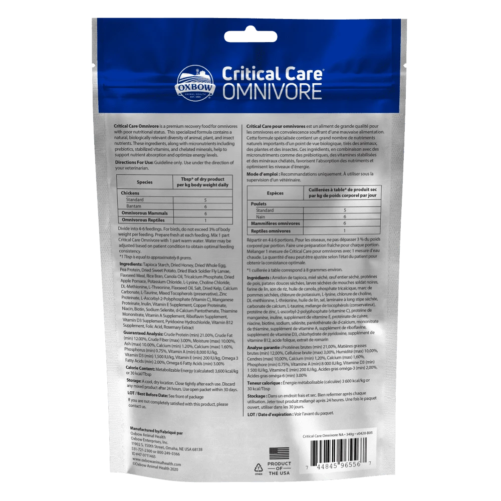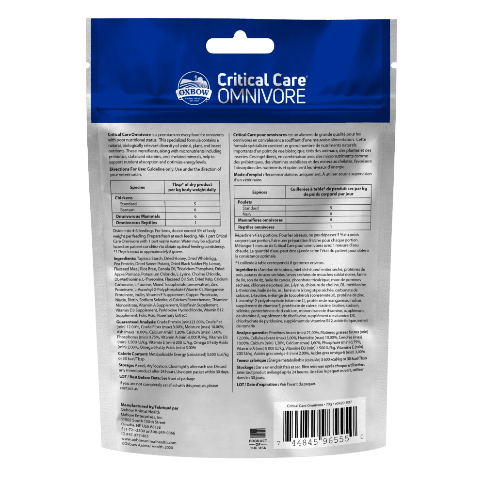 Divide into 4-6 feedings. For birds, do not exceed 3% of body weight per feeding. Prepare fresh at each feeding. Mix 1 part Critical Care Omnivore with 1 part warm water. Water may be adjusted based on patient condition to obtain optimal feeding consistency.