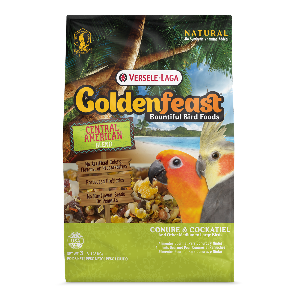 Goldenfeast® delivers a natural bounty of luscious, natural ingredients from all over the world. Companion birds will enjoy foraging through dried fruits and vegetables, assorted nuts, legumes, seeds, and ancient grains. Just like in nature, Goldenfeast® diets are free of artificial colors, preservatives, and flavors and do not contain synthetic vitamins. Protected probiotics are added to help support immunity and gut health.