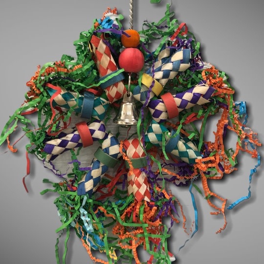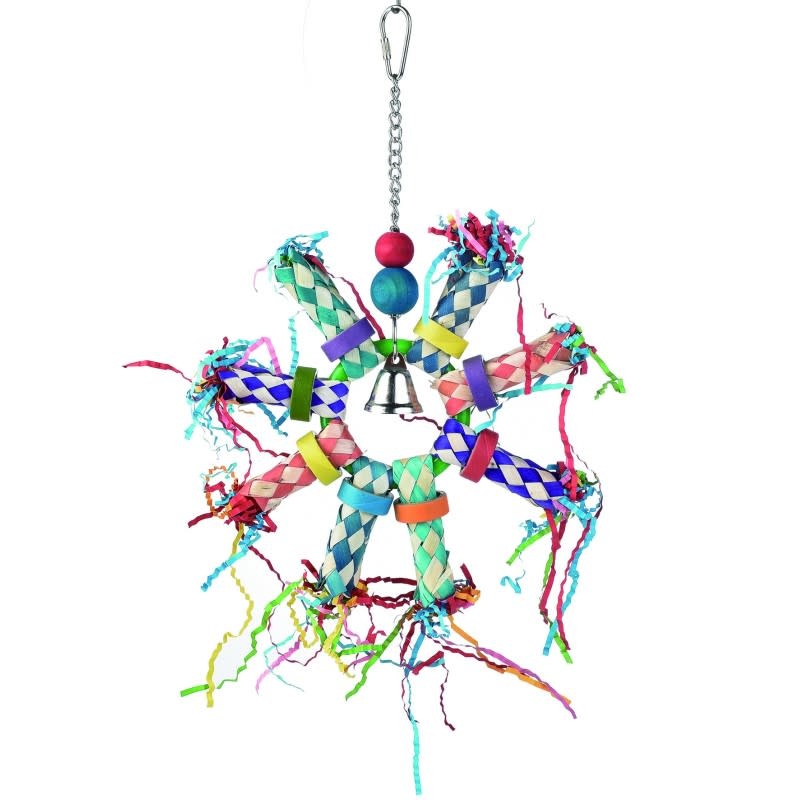 Ultra fun ferris wheel shaped bird toy with a plastic ring, bamboo shredders filled with crinkle paper shred, and bell.