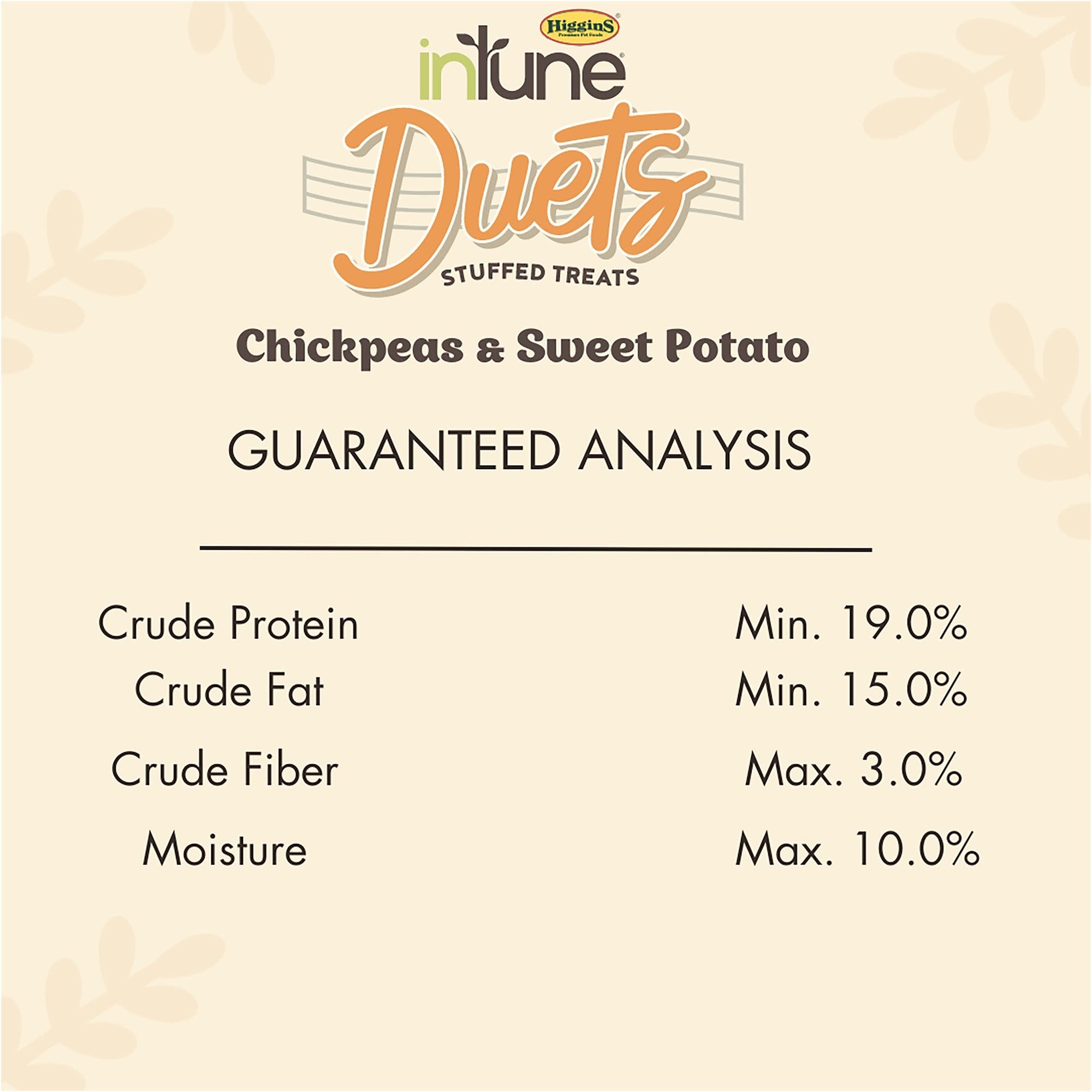 Intune Duets Chickpeas and Sweet Potatoes 3oz are delicious, soft bird treats made with wholesome, nutritious ingredients that birds love. Combining the natural goodness of chickpeas and sweet potatoes, these treats provide a healthy and rewarding option for parrots and companion birds.