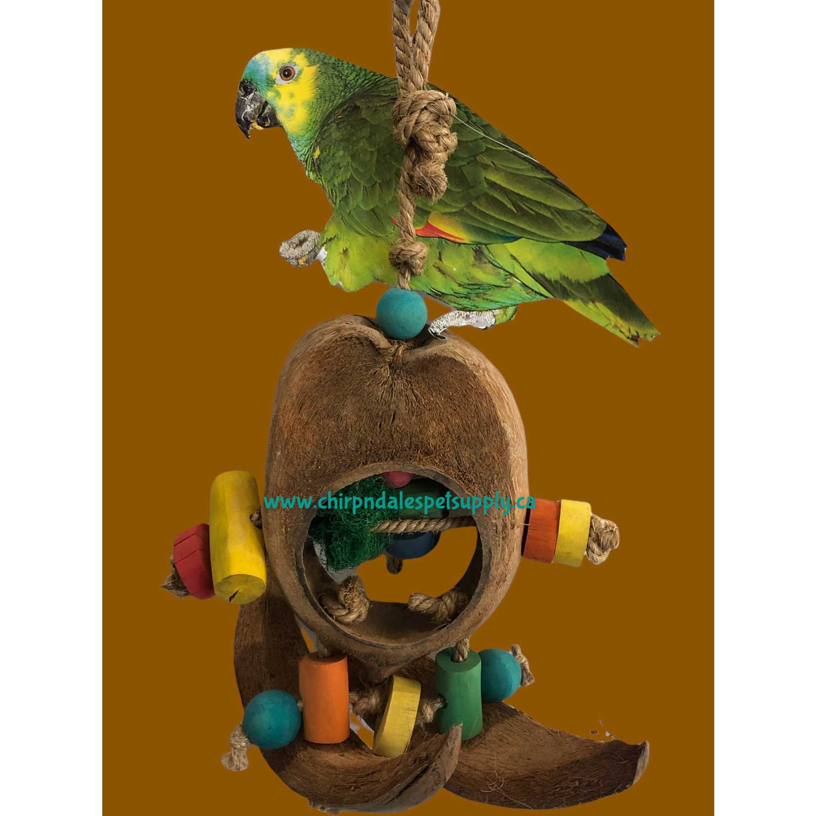 Fun colorful wood pieces with a coconut foraging station filled with luffa.