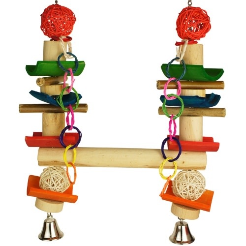 22” Long 22” Wide 5 lbThis swing is held together with chain so it is very durable. Weeks and weeks of fun for your birds, this swing is for the serious chewer!Made with Huge Chunks of Wood, 2 bells, chain & quick link.