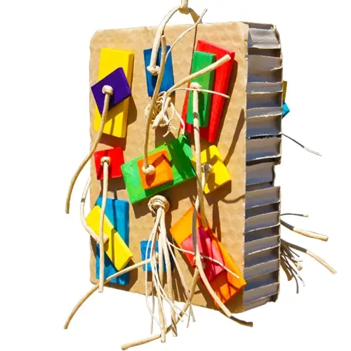 Solid Cardboard Box suspended by rolled paper and plastic link.