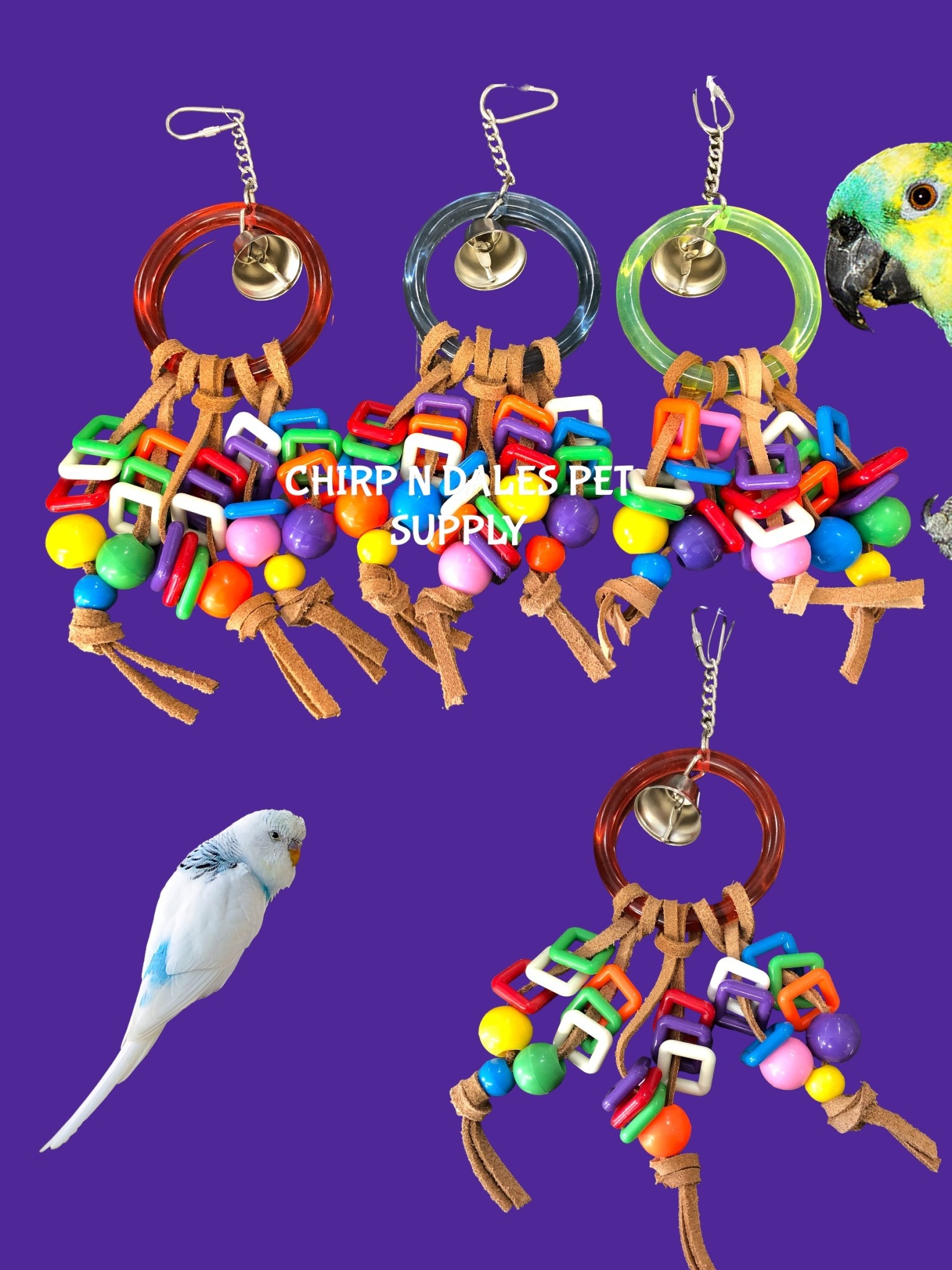 Ring that bell! This toy is comprised of plastic rings, bell, leather strip and chain and promises fun for hours!