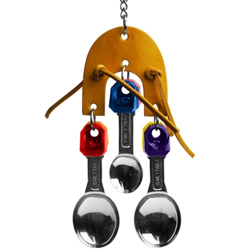 Horseshoe shaped leather piece with three measuring spoons hanging from it
