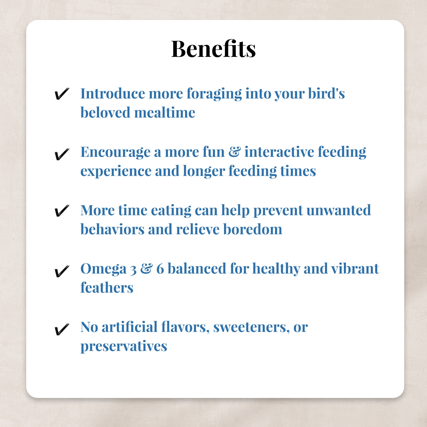 Each Foraging Fun Pack includes four trial size foods meant to help engage your bird’s attention and maximize time spent eating. Your bird experiences the unique shape of a Nutri-Berrie, the fun cake-like shape of an Avi-Cake, and the fruity sensations of our Tropical Fruit Pellets. Our foods provide ample opportunity for your feathered friend to “work for their food,” an activity they enjoy and greatly benefit from.