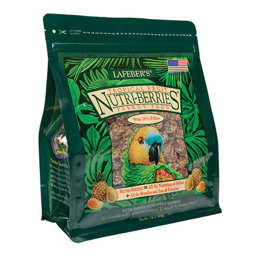 Parrots like Amazons, African Grey, and Pious, etc. are always on the one-eyed lookout for something extra special at mealtime. These birds crave foods full of taste and texture, which is exactly what they’ll find in Tropical Fruit Nutri-Berries with its whole seeds and grains mixed with real pieces of pineapple, papaya, mango, and 26% pellets all rolled into a berry shape a parrot can hold and delight in each bite.