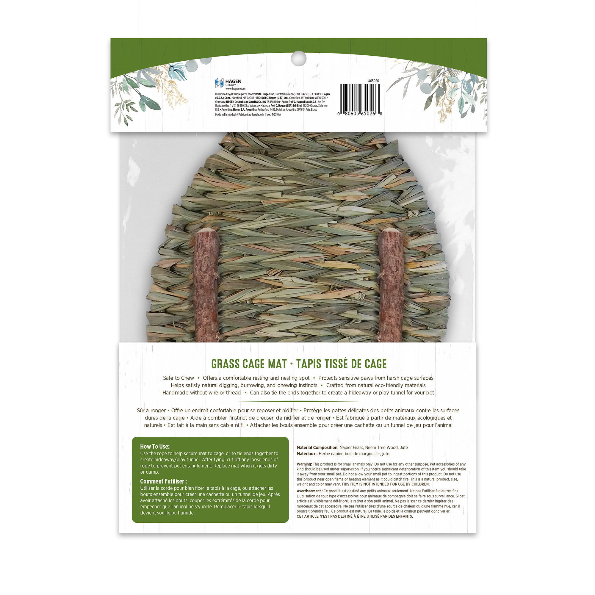 This all-natural hand-woven mat can be used as bedding, a chew toy or as a play mat by your small pet. When used as bedding, it’s soothing texture offers a comfortable resting and nesting spot. It can be used inside or outside your pet’s habitat and is ideal for protecting sensitive paws from wire bottom cages as well as a cover for a cage’s ramp. As a chew toy or play mat, it’s safe to chew and small treats can be hidden in between the woven layers to provide your small pet with hours of foraging fun; and gnawing on the neem wood branches is an excellent way for them to help maintain their dental health. The mat comes with rope to help secure it to the cage or tie ends of the mat together to create cozy hideaway or play tunnel.