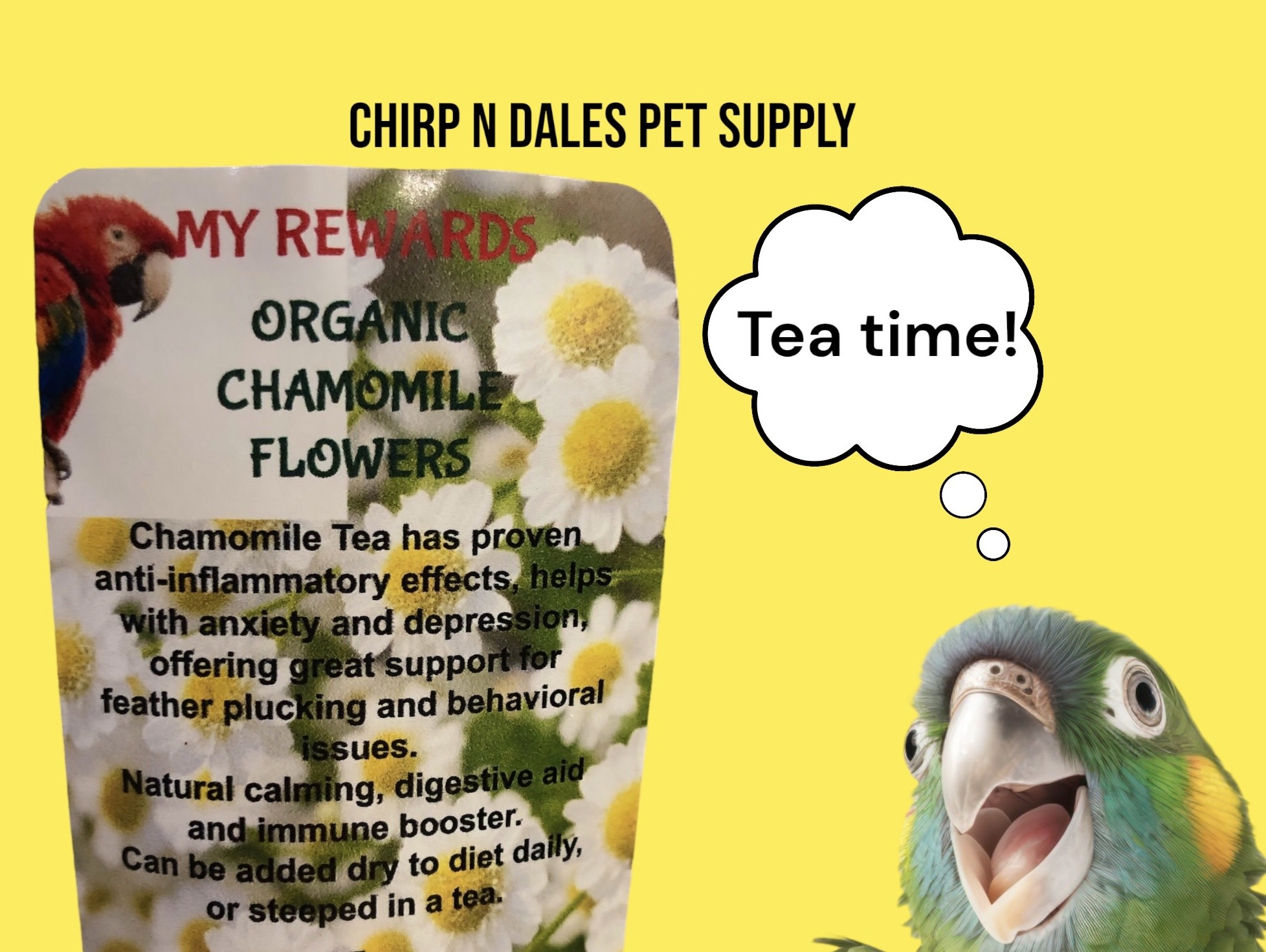 Chamomile Tea has proven anti-inflammatory effects, helps with anxiety and depression, offering great support for feather plucking and behavioral issues.Can be added dry to diet daily, or steeped in a delicious and fragrant tea.