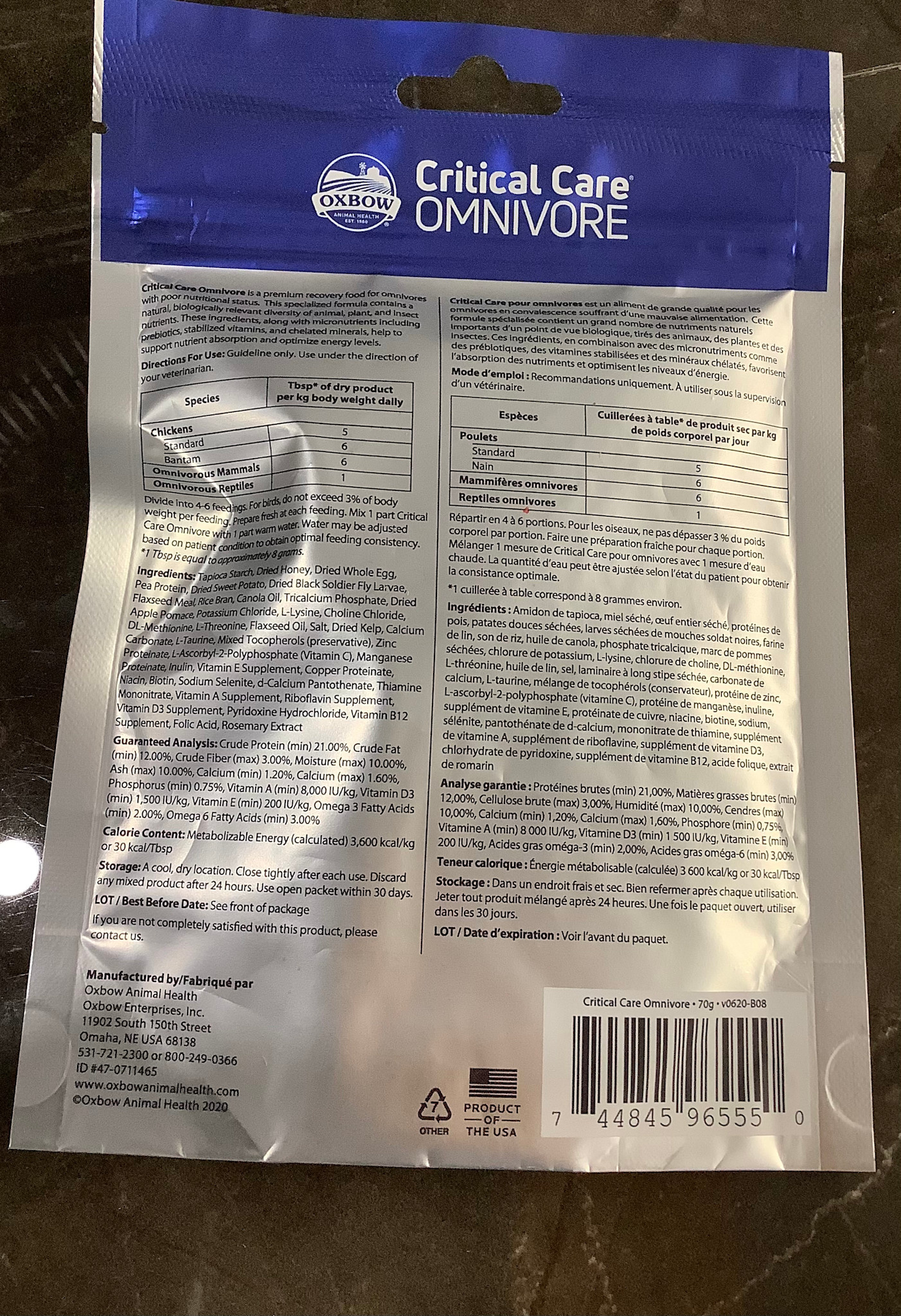 Divide into 4-6 feedings. For birds, do not exceed 3% of body weight per feeding. Prepare fresh at each feeding. Mix 1 part Critical Care Omnivore with 1 part warm water. Water may be adjusted based on patient condition to obtain optimal feeding consistency.