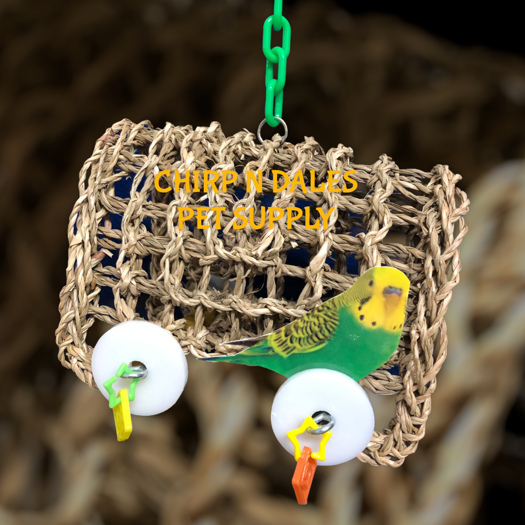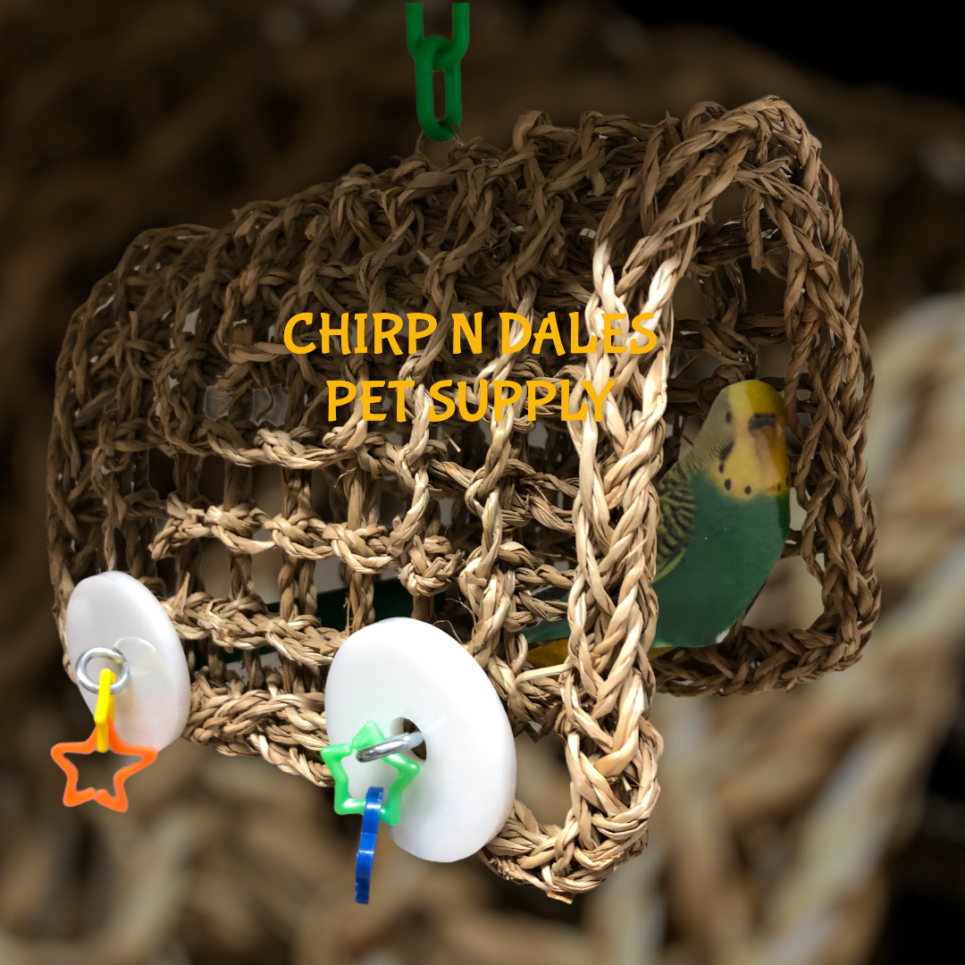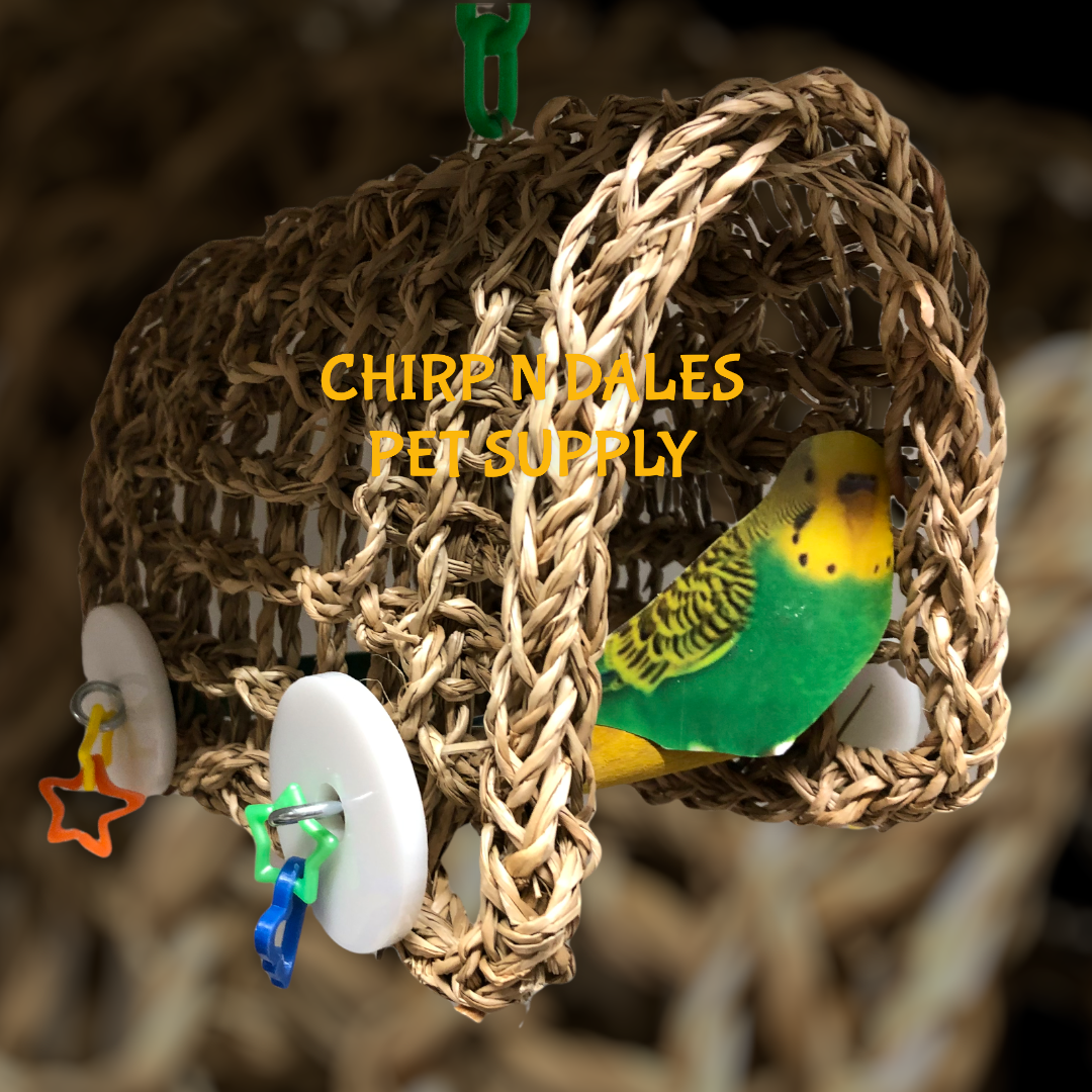 A cozy, natural seagrass swing hammock designed for medium parrots, featuring a handwoven structure, colorful acrylic toy attachments, and a durable plastic hanging chain for safe daily play and relaxation.