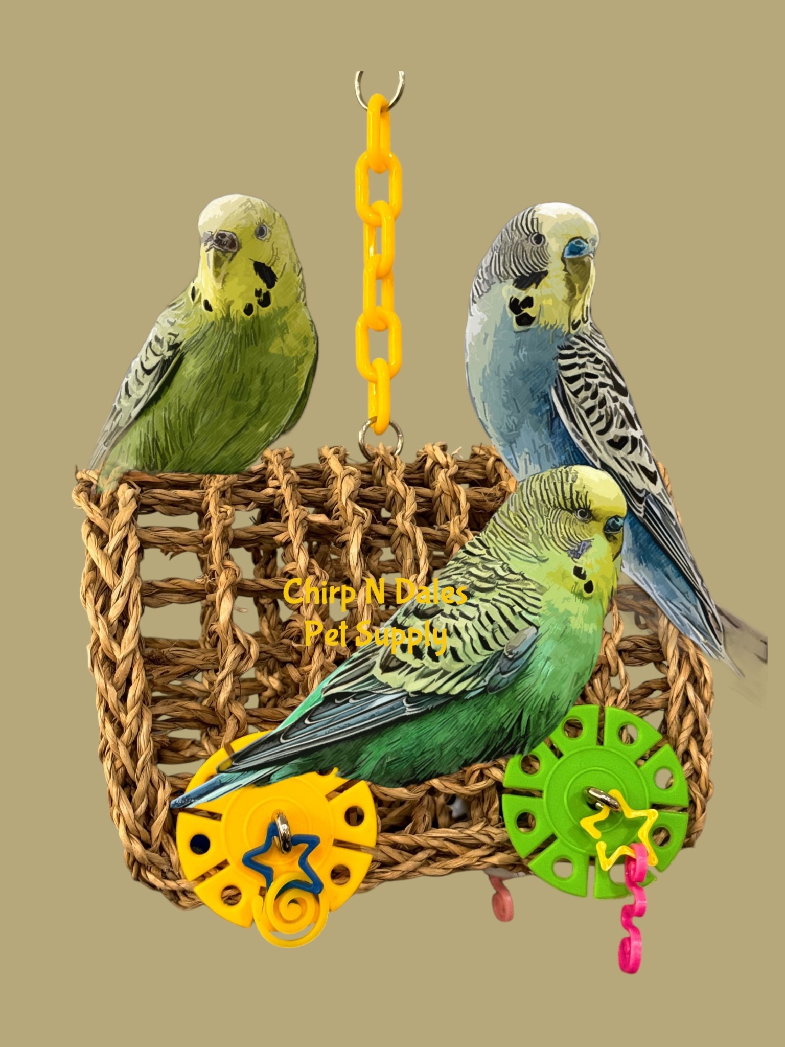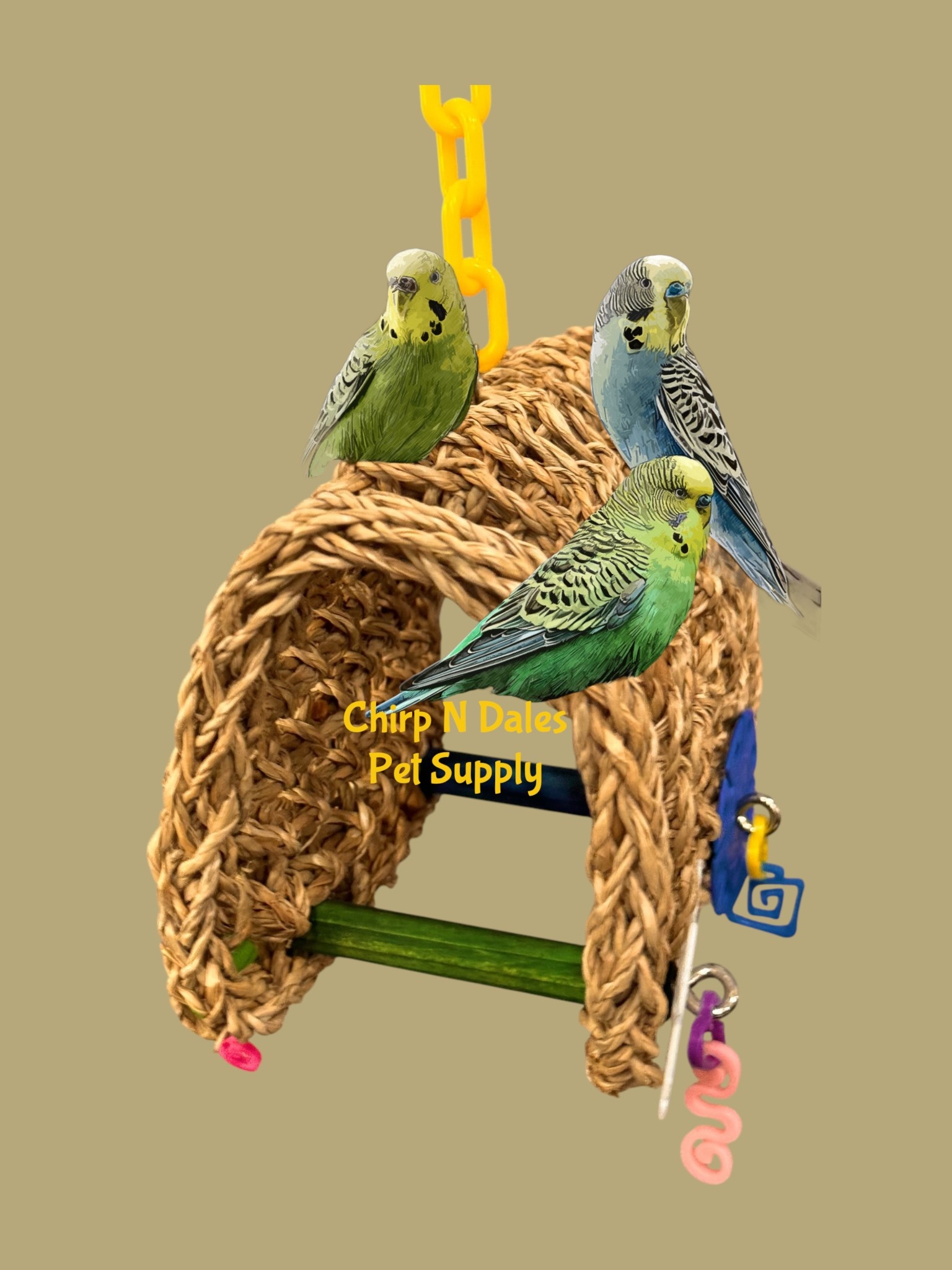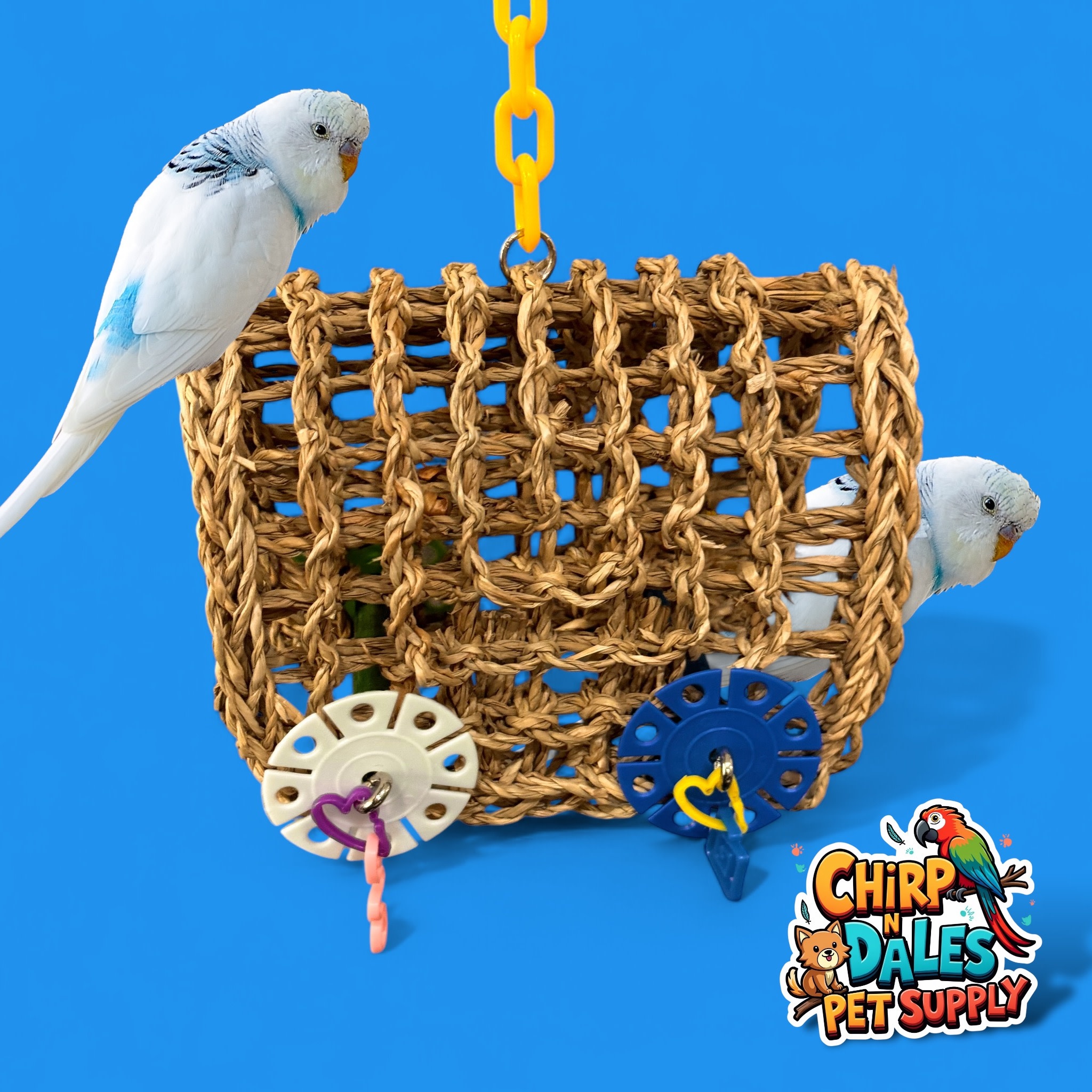 A cozy, natural seagrass swing hammock designed for medium parrots, featuring a handwoven structure, colorful acrylic toy attachments, and a durable plastic hanging chain for safe daily play and relaxation.