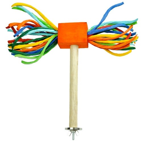 This perch attaches to any cage either sideways or hung upside-down from the top. It has a wooden block at the end with fun frizzle wrapped paper strings on each side for added perching enjoyment!