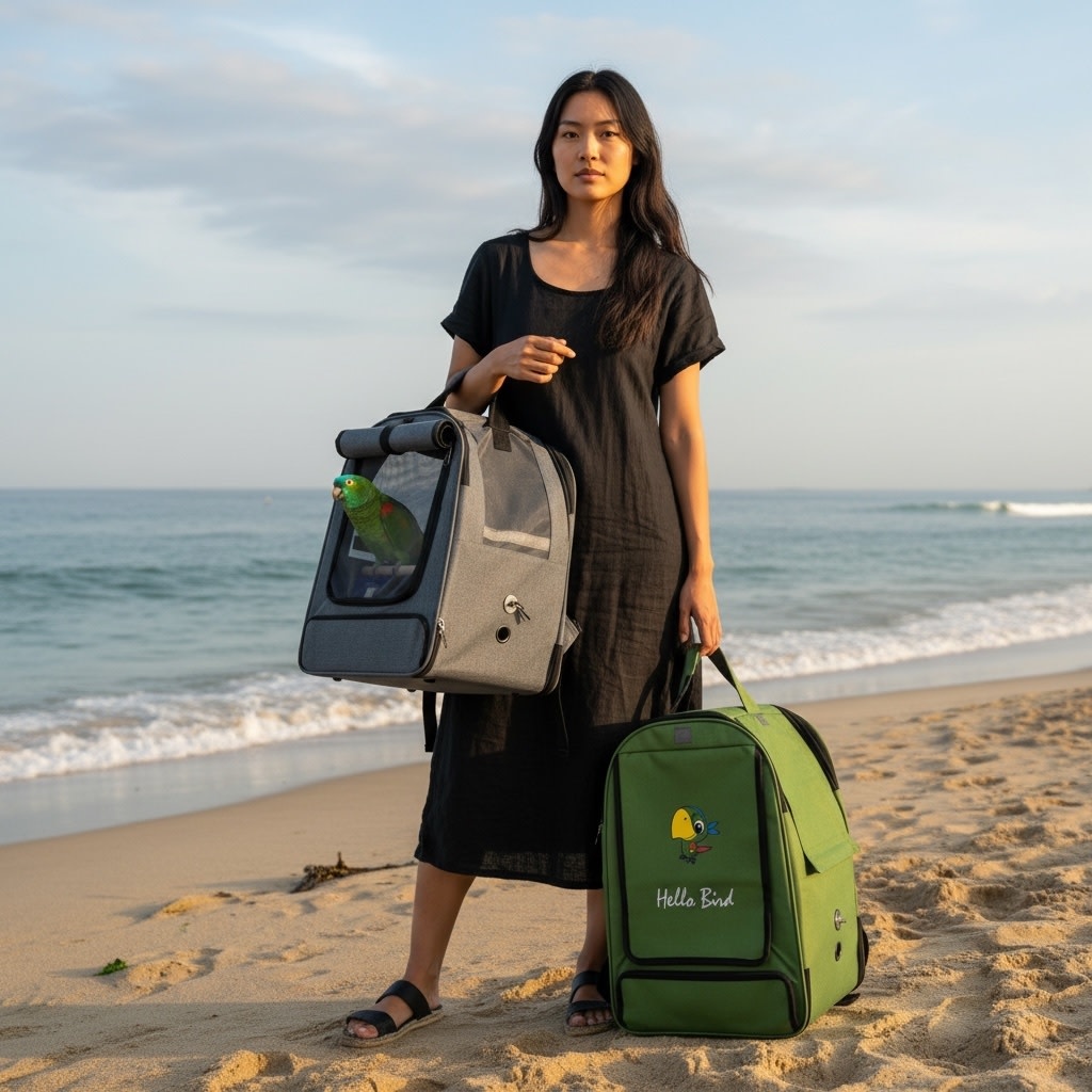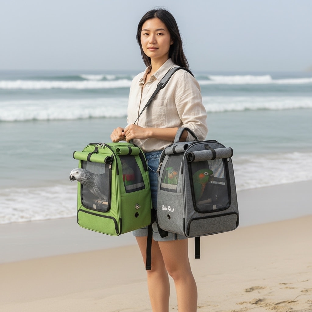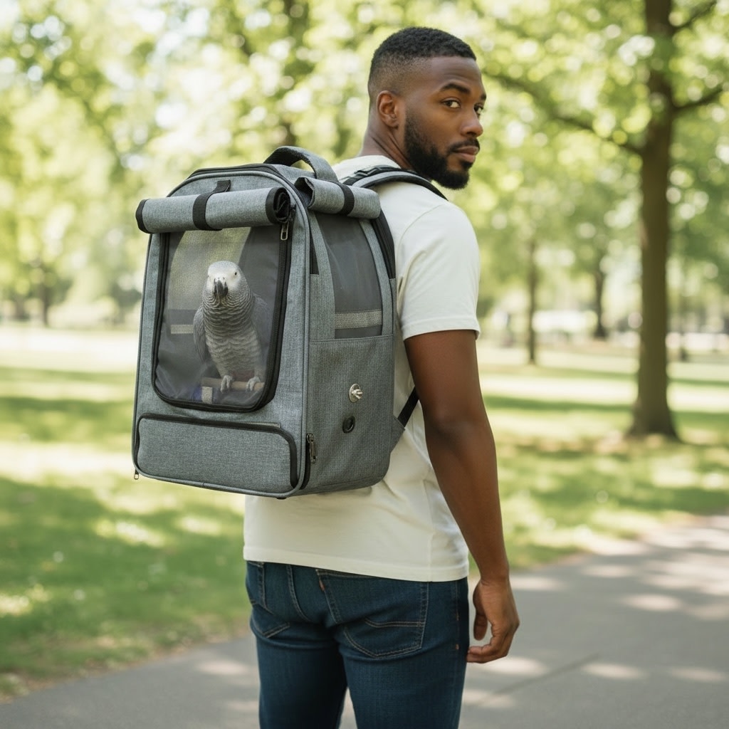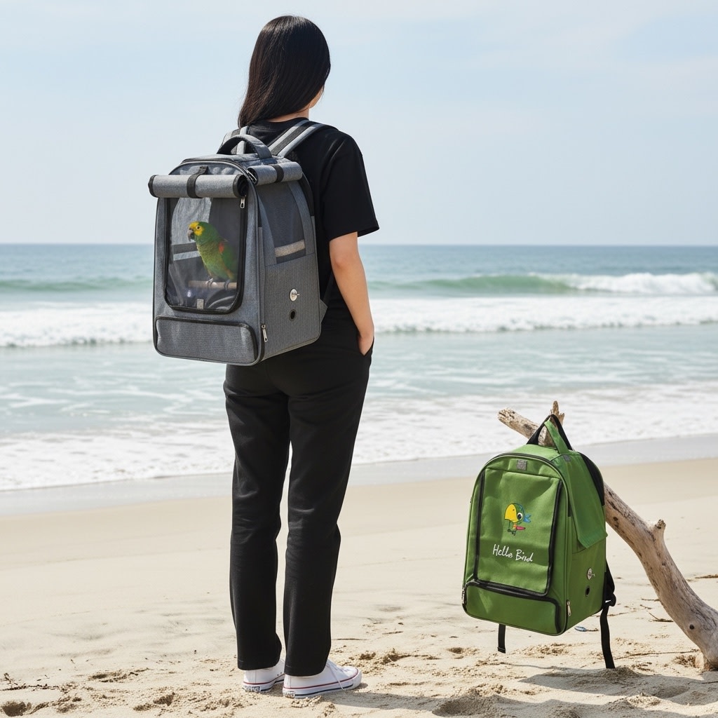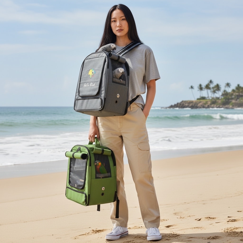 Take your feathered companion along for the adventure in comfort and style with the Hello Bird Fabric Backpack Carrier. Designed for safe and stress-free travel, this sturdy backpack is ideal for medium birds such as cockatiels, Indian ringnecks, African greys, amazons, and similar species.