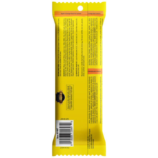 Wheat, Ground Wheat, Yellow Millet, Oats, Dried Carob, Cracked Corn, Corn Starch, Flaked Oats, Milo, Oat Groats, Dehydrated Apple, Corn, Dehydrated Oranges, Ground Corn, Dehydrated Mountain Ash Berries, Rice Flour, Calcium Propionate (a Preservative), Honey, Wheat Germ Meal, Lecithin, Ascorbic Acid, Dehydrated Carrots, Ground Oats, Vegetable Oil, Salt, Dehydrated Lemon, Tumeric Color, Color Added (Yellow 5, Yellow 6), Vegetable Fat, Vitamin A Supplement, Vitamin D3 Supplement, Vitamin E Supplement, Riboflavin Supplement, Pyridoxine Hydrochloride, Vitamin B12 Supplement.