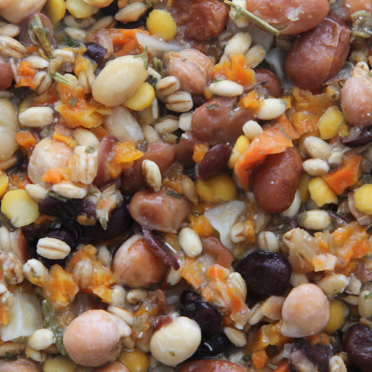Quinoa Flakes, Pearled Barley, Carrots, Dehydrated Black Beans, Dehydrated Sweet Corn, Dehydrated Lentils, Celery, Dehydrated Garbanzo Beans, Dehydrated Navy Beans, Parsley, Dehydrated Pinto Beans, Potatoes, Dehydrated Red Kidney Beans, Sweet Peppers, Rosemary, Tomatoes, Kelp, Dehydrated Vegetable Broth.