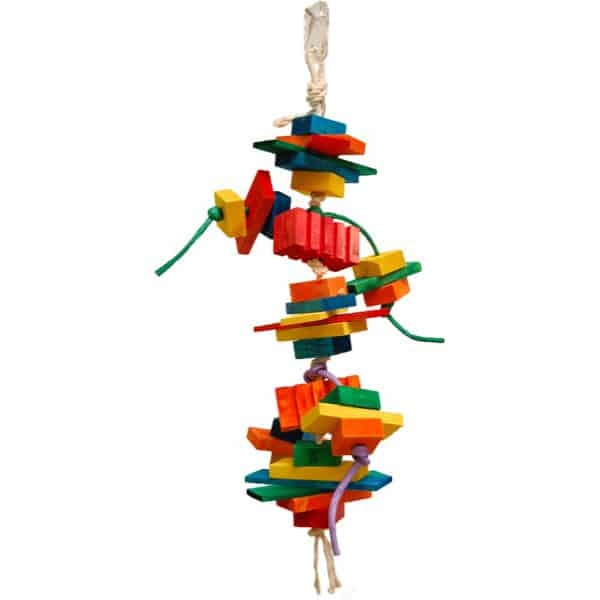 Coleop bird toy is made of paper rope, cotton rope, with several wood parts. Many different shapes including groovy wood blocks.