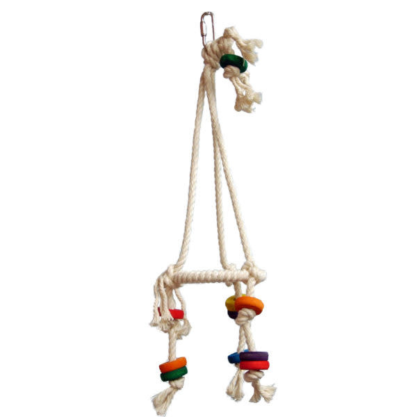 The original often copies, never equals! 100% cotton rope perch. They will love to play and perch. Great toy. With several pieces of wood for more fun. Excellent for several birds. Suspended by 1/4" cotton rope with a quick link.