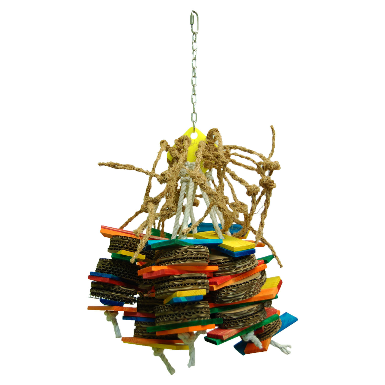 Toy made of cardboard slices and large slices of pine wood with coconut rope, they will have a great pleasure in shredding it.