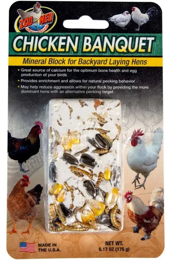 Zoo Med Chicken Banquet Mineral Block is a mineral supplement designed for backyard chickens. Encourages natural pecking while supporting overall flock health.