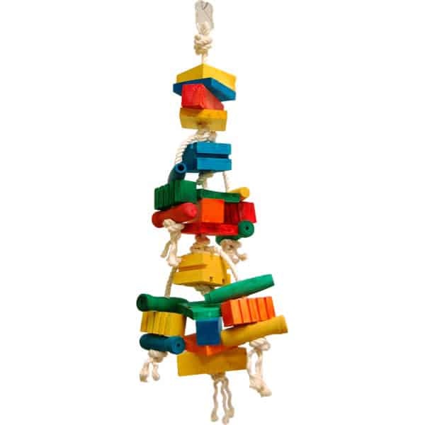 Coleop bird toy is made of natural paper rope, cotton rope, with several wood parts. Many different shapes including shredded cardboard and groovy wood blocks.